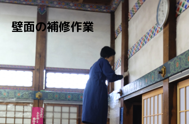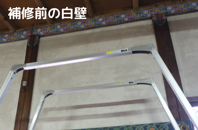 かつての能登半島地震の影響で、当時からヒビが入ったままになっていた箇所や、劣化して穴があいていた部分を補修しました。フレスコ画で学んだ技が思いがけず漆喰を塗る時に役立ちました。