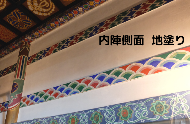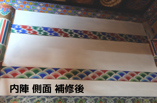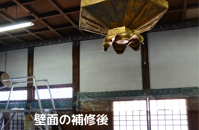 内陣は窓がなく外からの光が入らないので、電気を点けても壁面まで届きません。蝋燭やお香の煙で薄黒くなっていましたが、補修後キレイになりました。