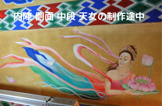 内側の天女は祖父が描いたもので、奥の壁面は私が描きました。阿弥陀如来の周りを飛天しているように向きを反対にしました。