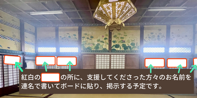 ②掲載方法:お名前は、ご支援金額ごとに連名で記載したものをボードに貼り、雲光寺の本堂 外陣 に掲示いたします。