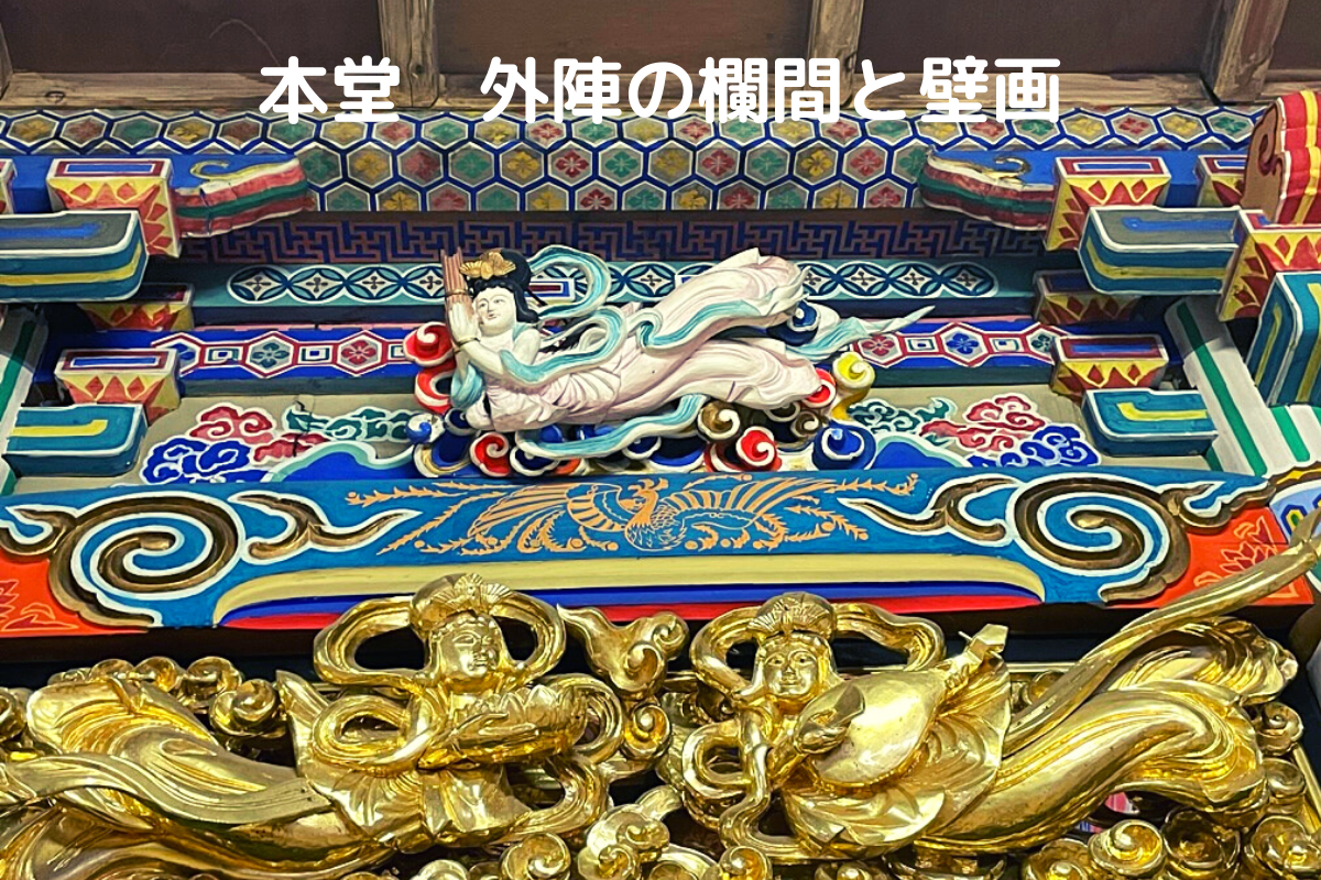 天女の欄間は、祖父が優しい色調に塗り替えました。壁面は鳳凰、雲など細かく表現されています。
