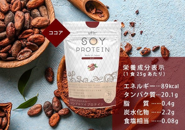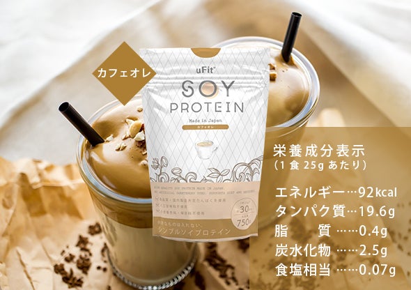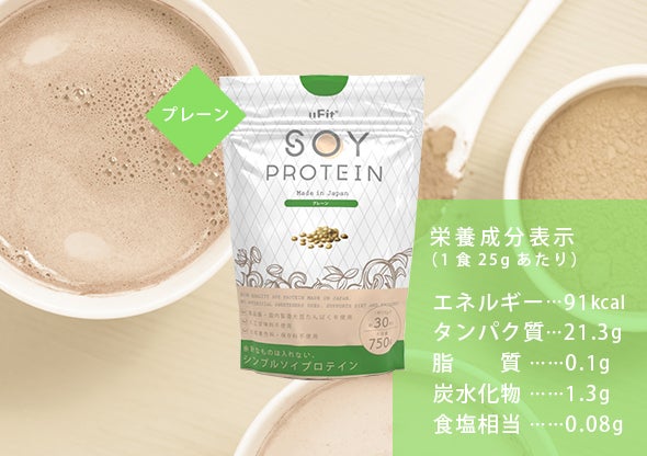 uFit Soyproteinは一杯あたりの脂質は0.1g、77キロカロリー(プレーン味)と低脂質/低カロリーにこだわりました。ダイエットや美容にこだわりがある方でも気にせず飲んでいただけます。