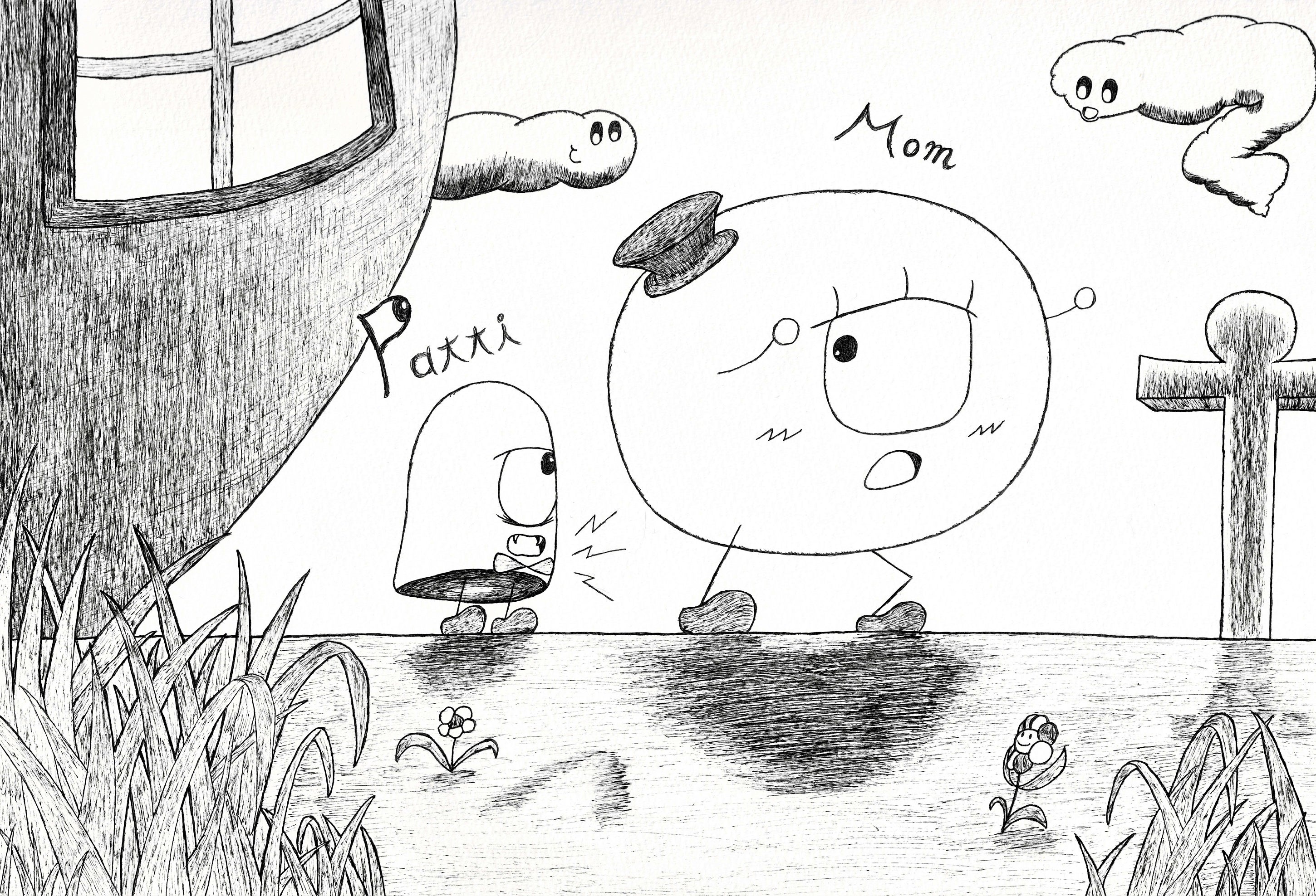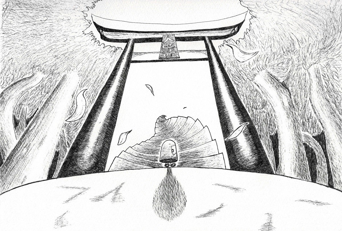 ■ボールペン絵「おばけのパッチと森の鳥居」■