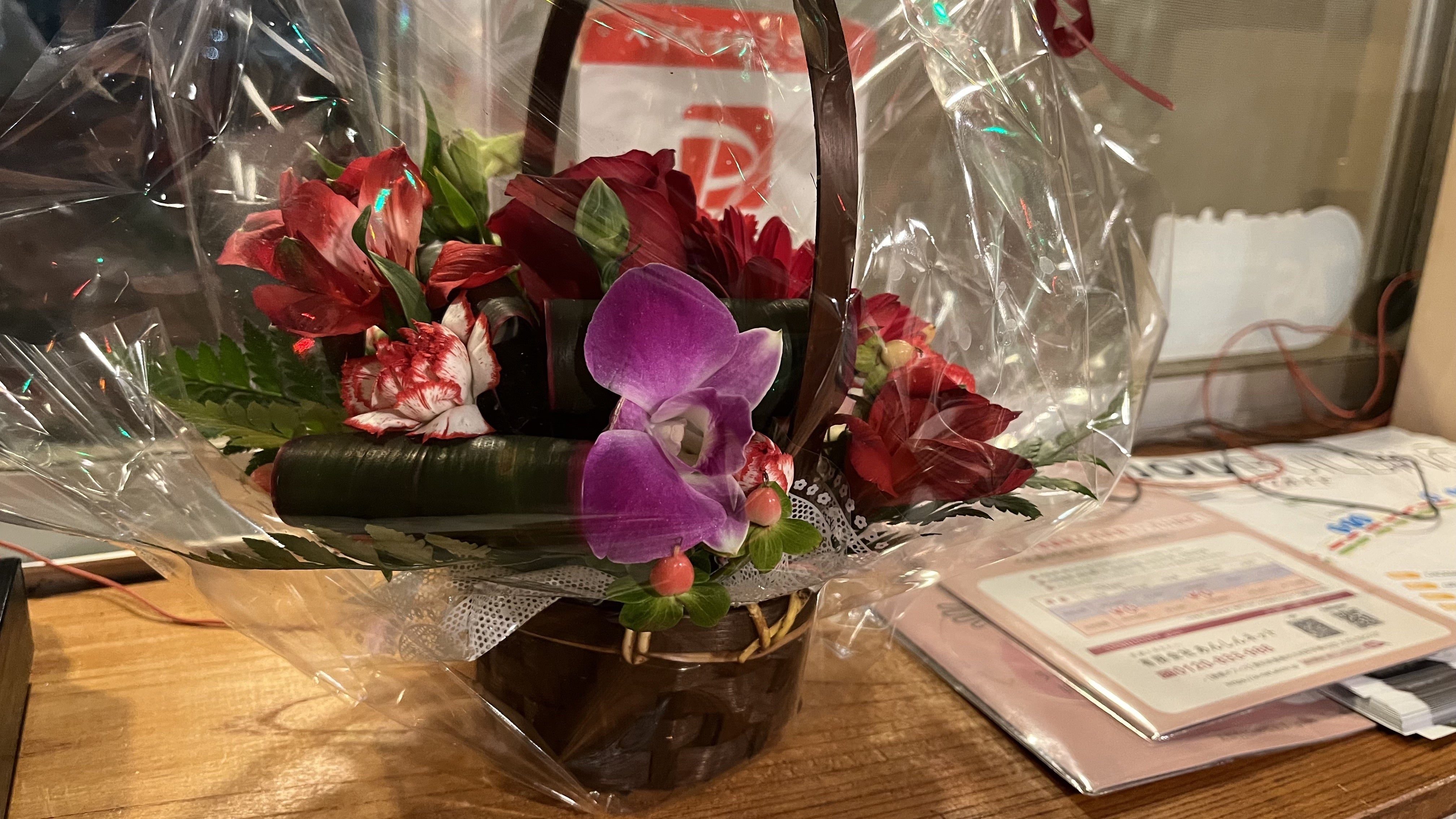 少し離れたところにいる古くからの友人が、花束を持って店に来てくれました。