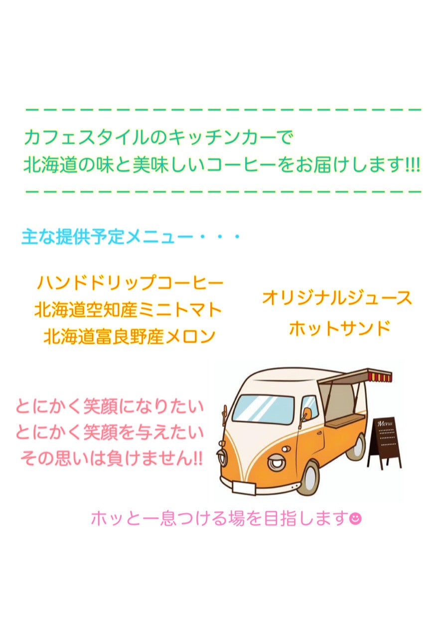 北海道の味と美味しいコーヒーをキッチンカーで関東圏のいろいろな場所にお届けしたいという思いから当プロジェクトを立ち上げました。
