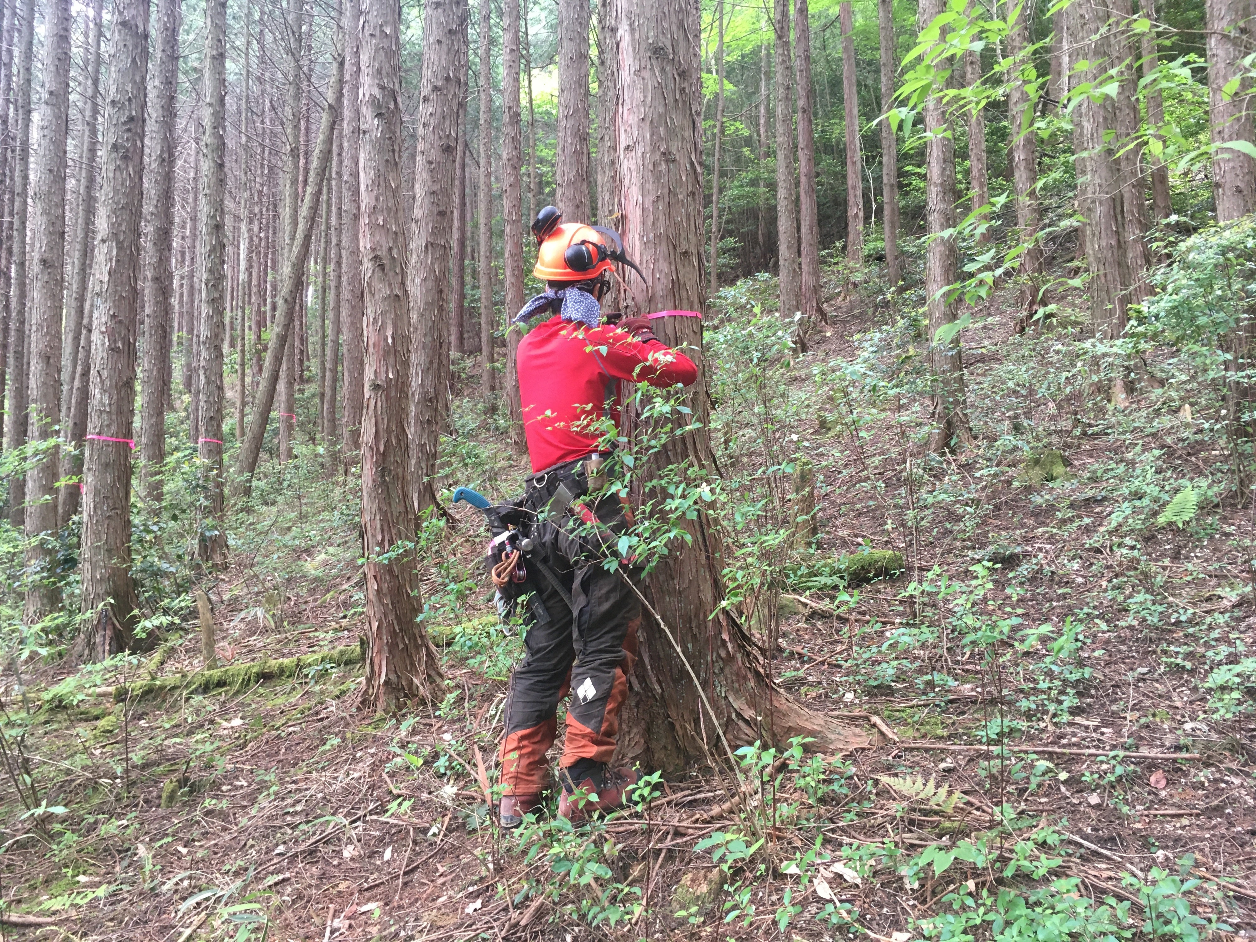 画像のように、どの木を切るべきか、地形や周りの木との関係を見ながら、選木して伐採していきます。