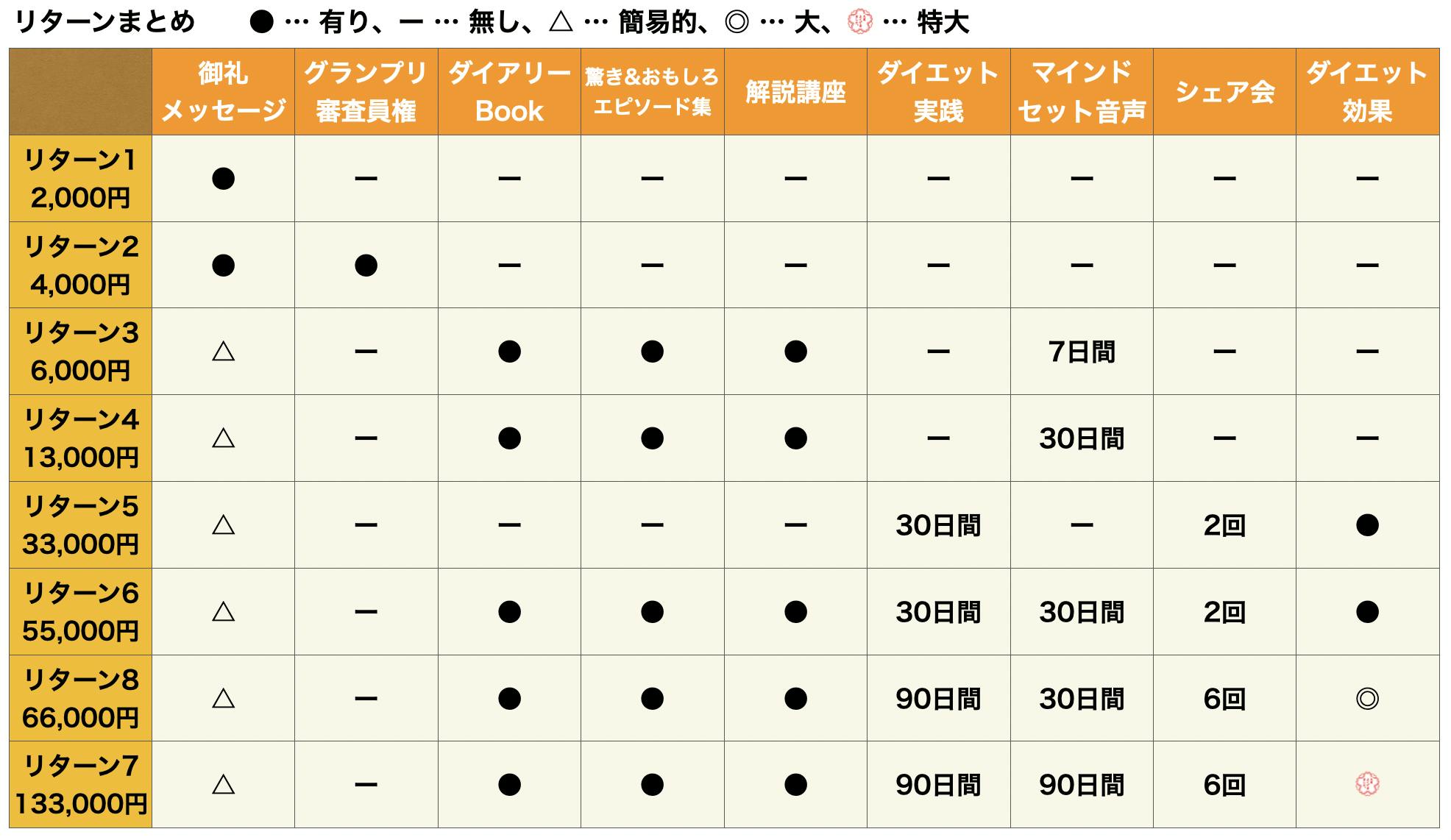 2022/05/16 17:24本日、リターン8の申請が承認されまたので公開しました。今までのリターンよりも、負担が減って、取り組みやすくなったのではないでしょうか。ぜひ、この機会にダイエットにチャレンジしてみて欲しいと思います。あなたのご参加、心よりお待ちしております。 もっと見る
