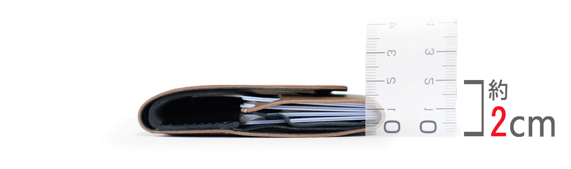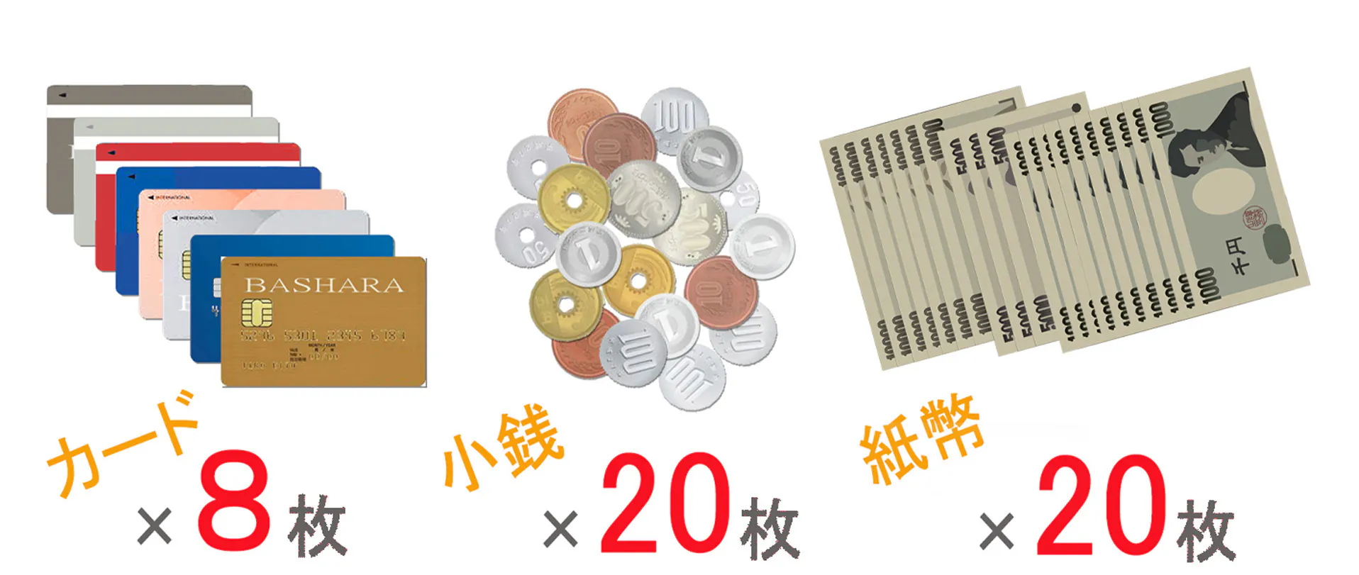 カード8枚、小銭20枚、紙幣20枚で、厚さは約2cm