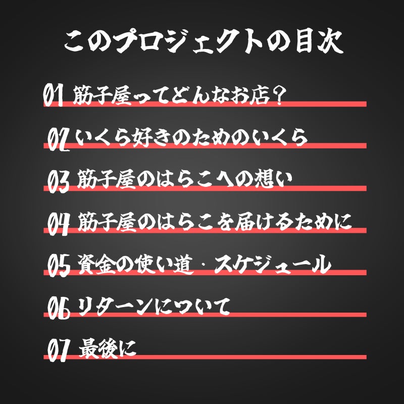 2025/08/08 20:00【大切なお知らせ】近年、全国的に鮭の漁獲量が減少しており、原材料の確保が年々難しくなっています。そのため、2025年より「筋子屋のはらこ(いくら)」は【CAMPFIRE限定】および【ふるさと納税返礼品】のみでの販売とさせていただくこととなりました。全国の皆さまに変わらぬ品質と想いを届け続けるために、数量を絞った限定販売とさせていただきます。どうかこの機会に、村上の恵みと私たちの想いが詰まった“いくら”をご賞味いただけたら幸いです。※製造量に限界があるため、【数量限定】とさせていただきます。CAMPFIREでチャレンジをして約3年が経とうとしています•••今年も筋子屋は、CAMPFIREでイクラの販売をすることにしました。↓↓↓↓↓↓↓↓↓↓↓↓↓↓↓↓↓↓↓↓↓↓↓↓↓↓↓↓↓↓↓↓↓↓↓↓【イクラ好きのためのイクラ】令和に復活した幻のイクラをご家庭に届けたい!クラウドファンディングの専用ページはこちらをタップ↓https://camp-fire.jp/projects/851885/view今年も筋子屋の自慢のいくらを提供できる年がやってまいりました。昨年は、また食べたいと注文いただく方が沢山いらっしゃいました。今年もクラウドファンディングを通して、獲れたて新鮮の鮭のイクラを先行販売として、皆様の食卓にお届けいたします。村上では鮭の卵を「はらこ」と呼びます。最高の鮮度と味をお届けするため、水揚げされた鮭からすぐに卵を取り出します。 鮭をこよなく愛する筋子屋が自信を持ってお届けする最上級の旬の秋鮭の子を使用した「幻のはらこ(いくら)」 分かりやすく言うといくら好きの方のための”いくら”です。8年前に廃業した「筋子屋」の復活プロジェクト、113名の方々からご支援をいただき、本当にありがとうございました。無事に筋子屋の製造場所に決定した空き家の期間が長かったため、老朽化が進んでいて、修繕が必要でしたが、水回りや内装関係も修繕を行い、製造場所として作業ができる環境を整え、2022年7月下旬頃に完成できました。2022年は、鮭を仕入れるための資金調達も行うことができ、筋子屋のハラコを多くの方に届けることができました。「筋子屋」の復活プロジェクトを通じて、沢山の人とのご縁があり、多くの人に筋子屋の想いを伝えることができました。そのご縁がきっかけで、2022年12月頃から、筋子屋の商品が新潟県村上市の名産品として…ふるさと納税に選ばれることになりました。皆様の心温かいご支援を頂き、鮭の仕入れと筋子屋の製造場所の修繕費、に当てさせて頂きました。本当にありがとうございました。このプロジェクトをSNSでシェアしていただけると、追い風になりますので、ぜひお願いできますと幸いです。活動に尽力していきますので、引き続き応援よろしくお願いします! もっと見る