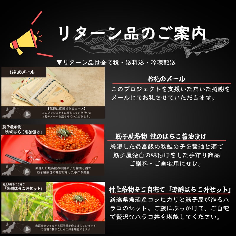 2023/04/20 08:28おはようございます。CAMPFIREでチャレンジをして約1年が経とうとしています•••今年も筋子屋は、CAMPFIREで新たなチャレンジをすることにしました。↓↓↓↓↓↓↓↓↓↓↓↓↓↓↓↓↓↓↓↓↓↓↓↓↓↓↓↓↓↓↓↓↓↓↓↓新商品!焼きたての焼き魚を超える味、、、ついに商品化!【ゴロっと焼鮭ほぐし】クラウドファンディングの専用ページはこちらをタップ↓https://camp-fire.jp/projects/view/599516?utm_campaign=cp_po_share_c_msg_mypage_projects_show筋子屋の自慢のいくらを提供できるのは期間が限られる。通年と通じて、皆様にお届けできるのものはないのか。を考えて今回、「ゴロっと焼鮭ほぐし」を開発して、日本中にお届けしたい!っと考えました!本当の”うまさ”を伝えたい国内で流通している鮭フレークを見ると、生産国を問わず、保存料や添加物入りの商品が多いことが分かります。試食していただく中で、幼いお子様も喜んで食べられていたとの声に触れ、本来の素材の味を引き出すため、食材は国産鮭と笹川流れの塩のみ、保存料や添加物は一切なく無添加での製造を決意しました。※筋子屋の「ゴロっと焼鮭ほぐし」と市販の鮭ほぐしとの色味と身の大きさの違い「ゴロっと焼鮭ほぐし」で使用している笹川流れの塩は、国の名勝天然記念物(県立自然公園)に指定され、日本百景にも選定された県下有数の海岸景勝地で、澄んだ海水は日本有数の透明度を誇る、笹川流れ(ささがわながれ)。そんな沖縄の海のような透明度抜群の美しさで作られた旨味が凝縮された塩です。老若男女、全ての世代に届けたい筋子屋の鮭を試食していただく中で頂戴した「食が細い子供も沢山食べてくれる」、「定期的に送ってほしい」等の声が、商品化の大きな後押しになりました。老若男女問わず喜んでいただける「ゴロっと焼鮭ほぐし」を、ぜひ皆様にお届けしたいと思いました。8年前に廃業した「筋子屋」の復活プロジェクト、113名の方々からご支援をいただき、本当にありがとうございました。無事に筋子屋の製造場所に決定した空き家の期間が長かったため、老朽化が進んでいて、修繕が必要でしたが、水回りや内装関係も修繕を行い、製造場所として作業ができる環境を整え、2022年7月下旬頃に完成できました。2022年は、鮭を仕入れるための資金調達も行うことができ、筋子屋のハラコを多くの方に届けることができました。「筋子屋」の復活プロジェクトを通じて、沢山の人とのご縁があり、多くの人に筋子屋の想いを伝えることができました。そのご縁がきっかけで、2022年12月頃から、筋子屋の商品が新潟県村上市の名産品として…ふるさと納税に選ばれることになりました。皆様の心温かいご支援を頂き、鮭の仕入れと筋子屋の製造場所の修繕費、に当てさせて頂きました。本当にありがとうございました。このプロジェクトをSNSでシェアしていただけると、追い風になりますので、ぜひお願いできますと幸いです。活動に尽力していきますので、引き続き応援よろしくお願いします! もっと見る