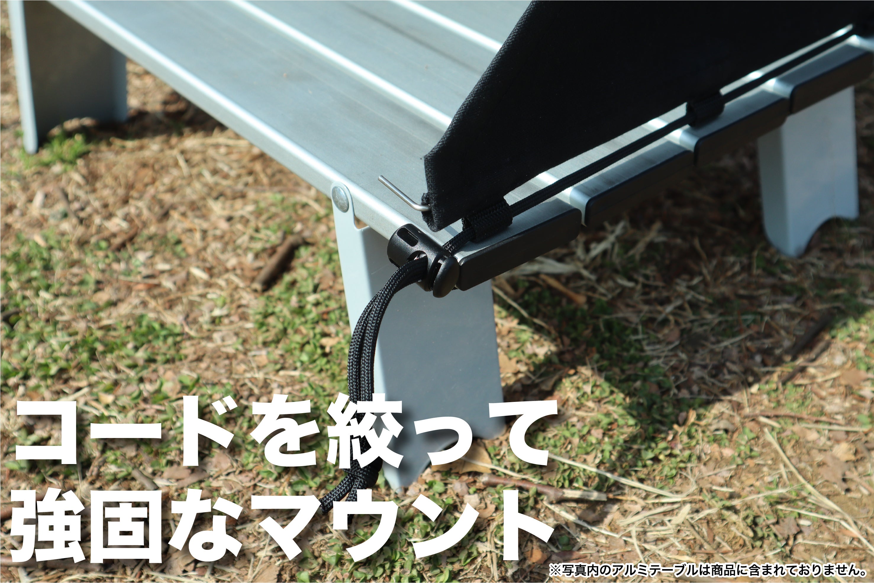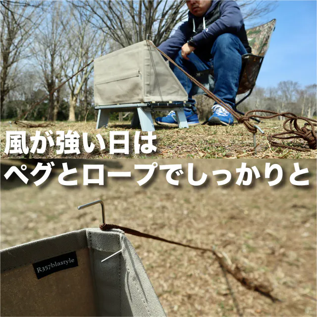 ※勿論、必要に応じて「ロープ+ペグ」の使い方でより強固な固定が可能です。
