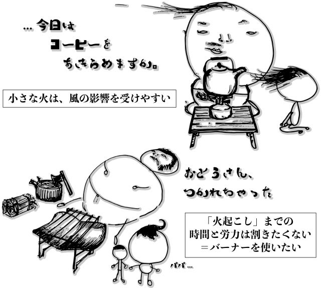 焚き火とは違い、現地に到着してすぐに使える「アルコールバーナー/ガスバーナー」はとっても便利です!!
