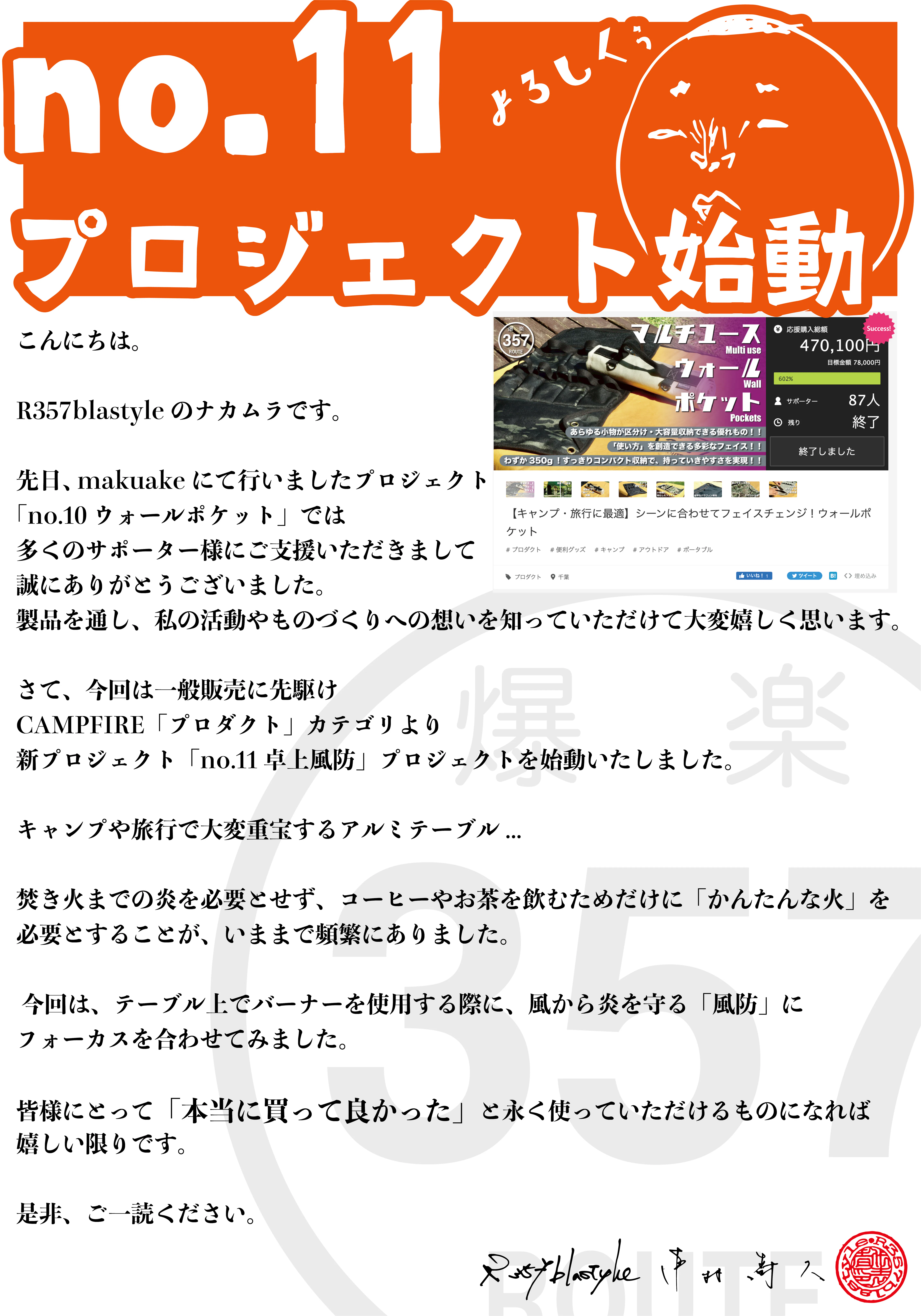 2022/04/08 23:09こんばんは、R357blastyleのナカムラです。連日のご声援・ご購入をいただきましてありがとうございます。私自身、ものづくりの活動や日々の生活をしていく上で大変励みになっております。さて、【no.11】プロジェクトについて本プロジェクトは4/8時点で、プロジェクト公開を残すところ約20日となりました。私としましては、来週あたりに各種材料の発注と順次、本製品の製作着手を考えております。現在、ご購入いただいておりますサポーター様へ5/1からなるべく早い段階でリターンのお渡しができればと思います。まだ、ご購入いただいていない方も是非、ご一読ください。アルミテーブルをお持ちであれば、持っていて損はない1品と自負しております。また、私自身「Makuake(マクアケ)」や「BASE(ベイス)」なども使用しておりますので、私が今まで手掛けました製品にご興味がある方は、是非ご覧ください。Makuake(前回プロジェクト【no.10】) https://www.makuake.com/project/r357blastyle6/BASE https://r357blastyle.handcrafted.jpありがとうございました。 もっと見る