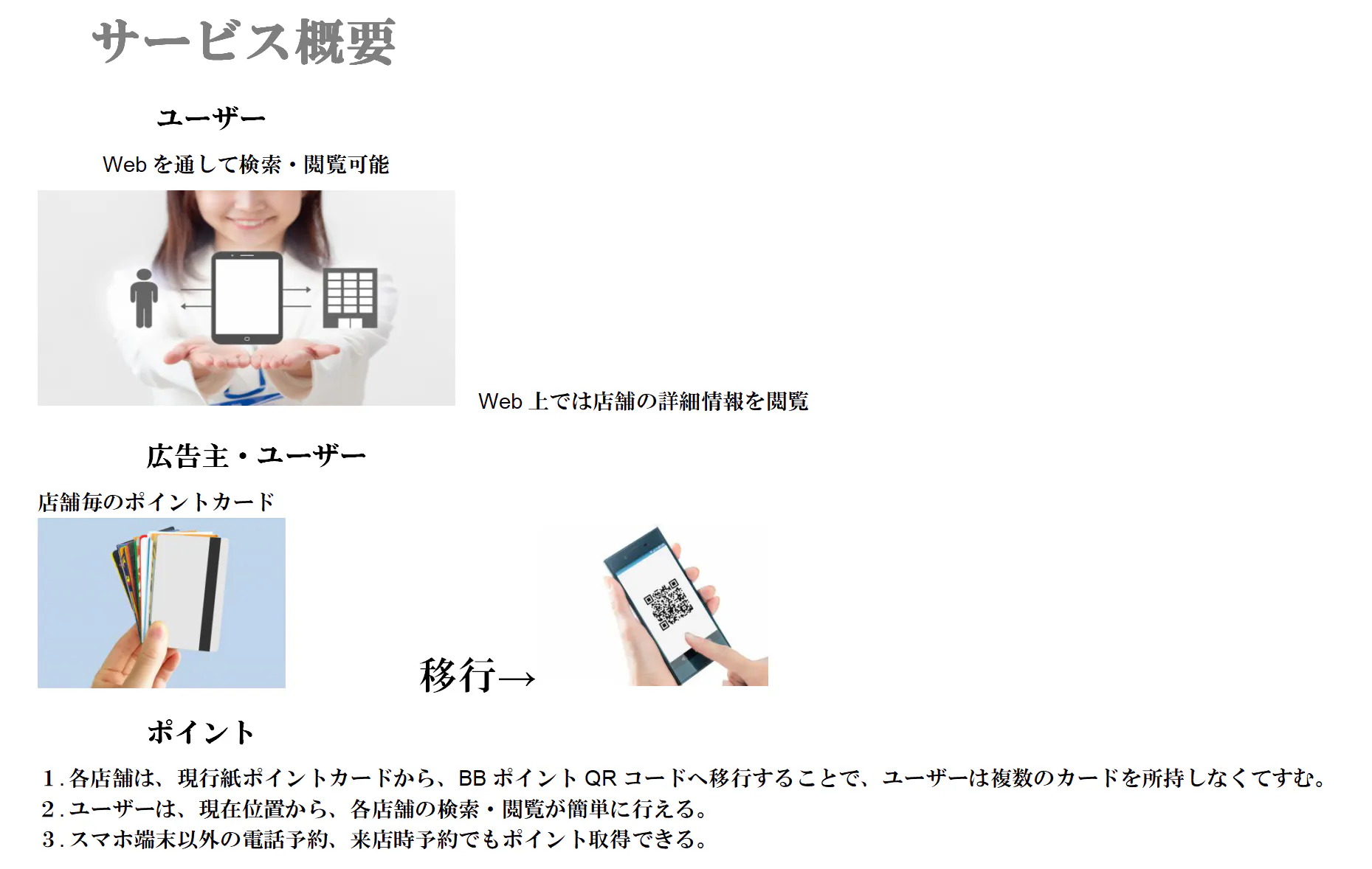 ・ スマホ内QRコードを使ったシステムでリラク・ヘア・エステ・ネイル・脱毛サロン等に特化したた来店ポイントで、他店舗展開(全国展開)を図り、掲載店舗間でポイントを貯めるいくことにより他業種店舗顧客ユーザーが新規客として来店する可能性が期待できる。