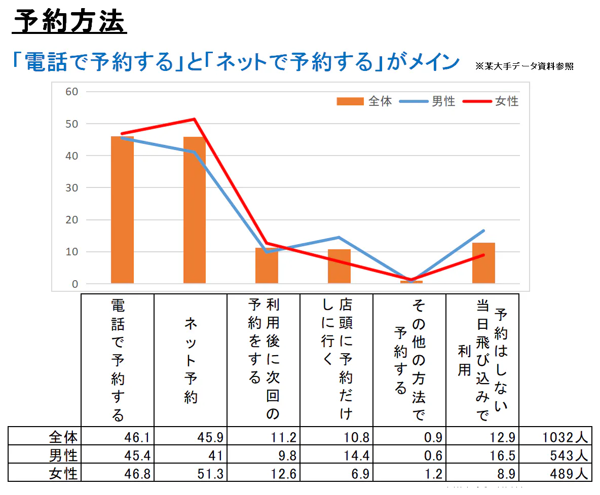 現在、予約はネットからのユーザーが大半を占めてると思われてる店舗様が多く見受けられますが、実情は、約50%の方が電話・直接来店等で来店されています。ネット予約以外のユーザーは、正規料金で来店される事が多い為、店舗にとって売上アップに繋がり又、正規料金ユーザーはリピート率が非常に高いとされてます。今後は、ネット予約以外新規ユーザーの獲得を強化する事で、売り上げアップに繋がると考えられます