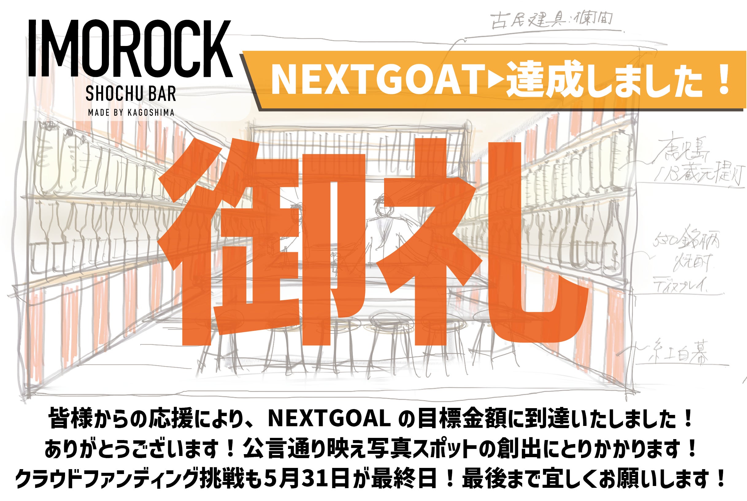 こんにちは!グッドフェローズダイニングです!みなさまからの温かいご声援&ご支援により…開始2日で目標達成いたしました^^ありがとうございます!!!ここからはさらにかっこいいSHOCHUBARの創造に向けてNEXTチャレンジを実施中です!IMOROCKを訪れた皆様の想い出作りに一役買えるようNEXTGOAL100万円に到達したら「PhotoSpot」を新設いたします!ぜひお楽しみに!