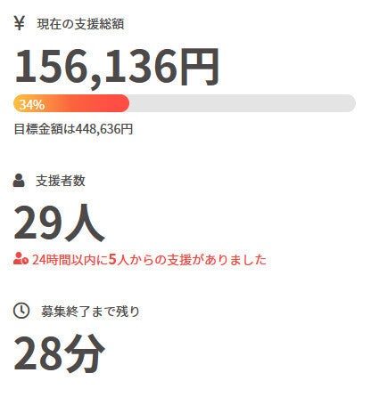 現在の調達率は34%、パトロン様は29名となっております。