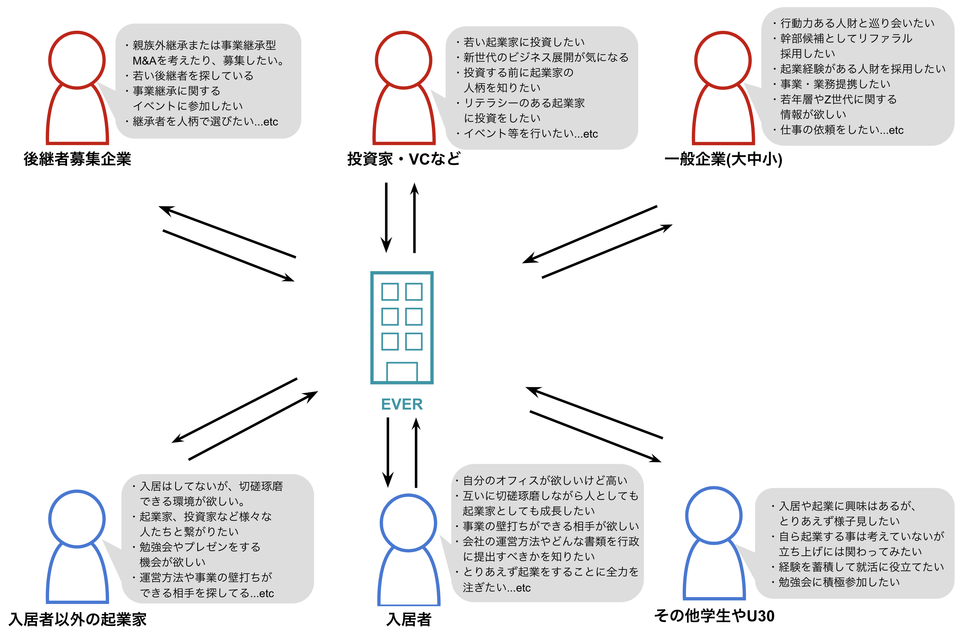 若き挑戦者達(起業家、起業志望者、起業に関わりたい人、事業を引き継ぎたい人、リファラル採用を狙う方々)が