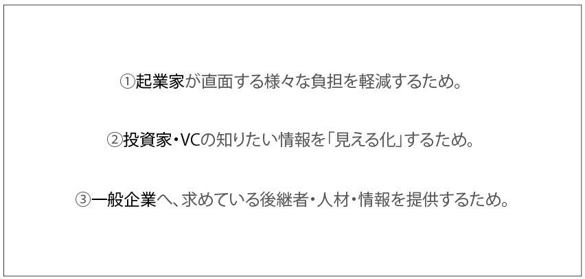 ①起業家をはじめとした、高い志を持つ若人が直面する様々な問題や負担を軽減するため。