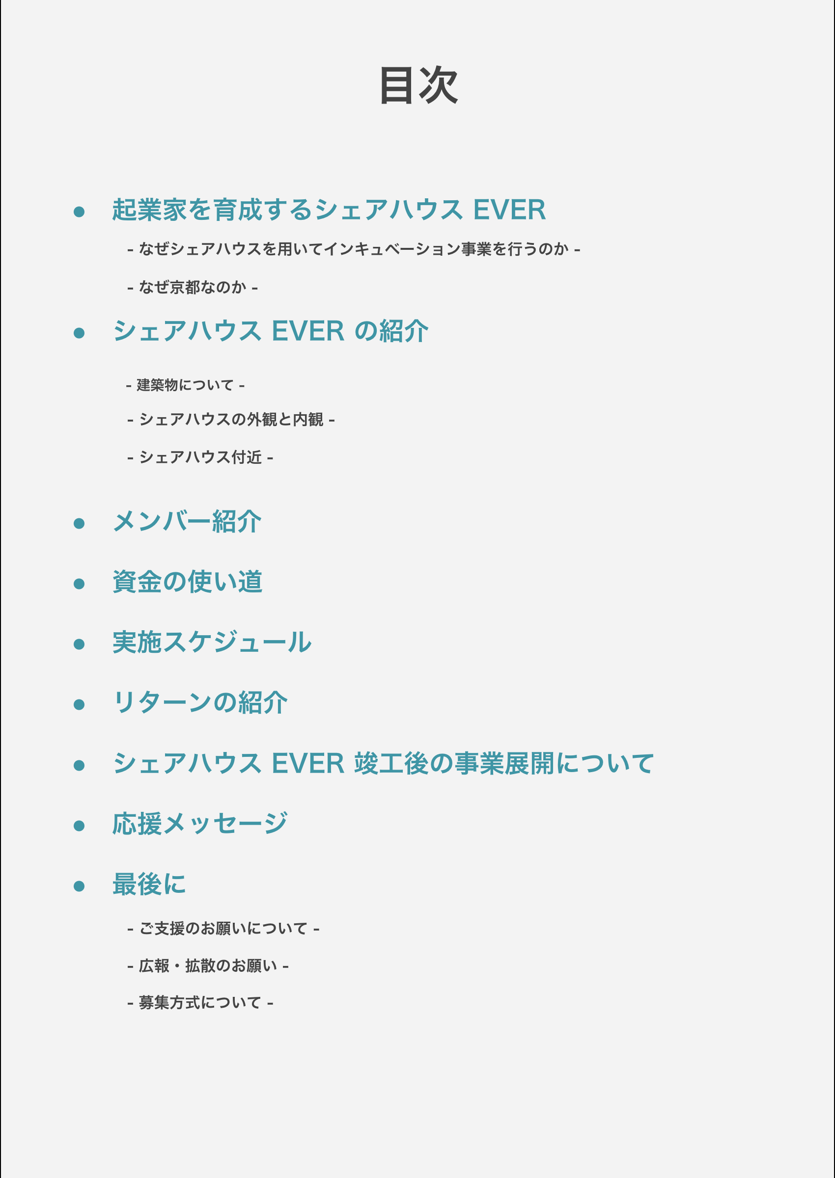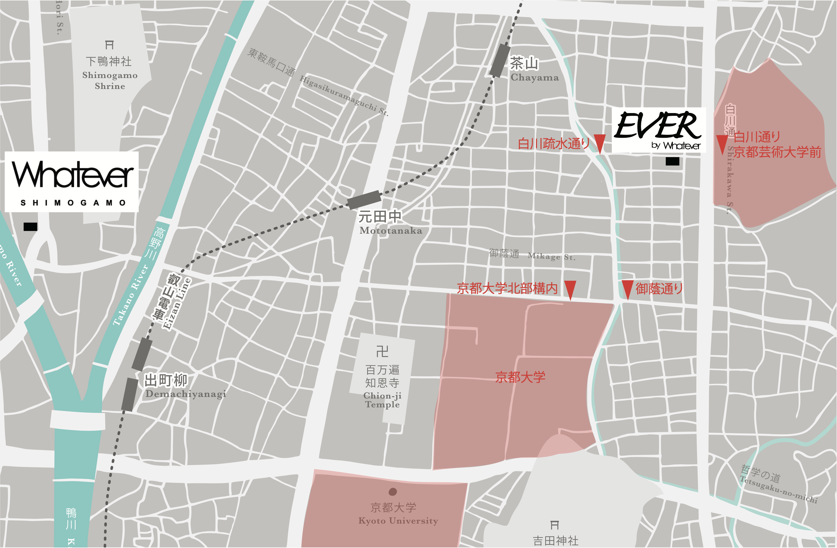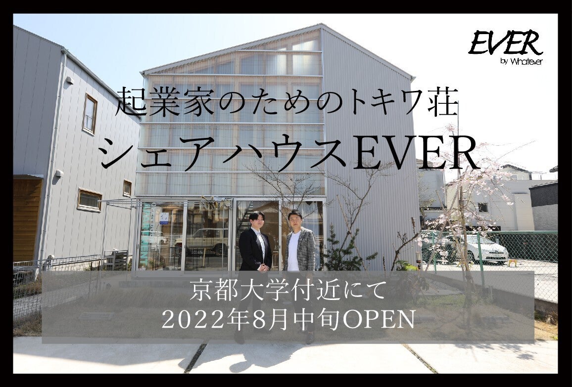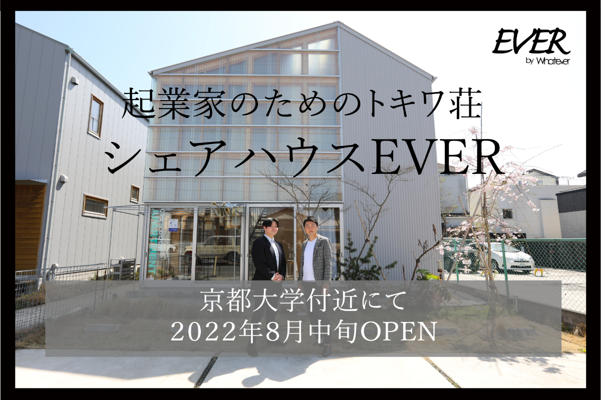 冒頭の"はじめに・ご挨拶"の際に僅かながら紹介させていただきましたが、弊社は2021年10月から京都の鴨川デルタ・下鴨神社にほど近い場所で、シェアオフィス「Whatever SHIMOGAMO」を開業しました。多くの方々との出会いやご好意により僅か4ヶ月で16室の個室は満室となり、現在の通り活気に溢れております。弊社代表の楪葉と戦略コンサルタントの土屋も、このシェアオフィス「Whatever SHIMOGAMO」で貸主、借主として出会い、共に事業を進める間柄となりました。この出会いから、「異業種同士が交われば面白い事業を作ることができる」という考えが私たちの共通認識となり、その認識をより深め形にしたサービスがこのシェアハウスEVERです。若き起業家がこのシェアハウスに入居し仲を深め、互いに切磋琢磨し、共に青春を過ごし、時にはビジネス交流をし、大きく成長し日本を代表する経営者となるかもしれません。このシェアハウスは、私たちの出会い以上に「大きく深い繋がり」が生まれ京都から日本へ大きな変革をもたらしてくれると、私たちは信じています。どうか、これからも私たちの事業だけでなく、このシェアハウスに集う起業家たちの活躍もどうぞご期待ください。ご支援のほど、よろしくお願い致します。また、長文にお付き合いいただき、誠にありがとうございました。