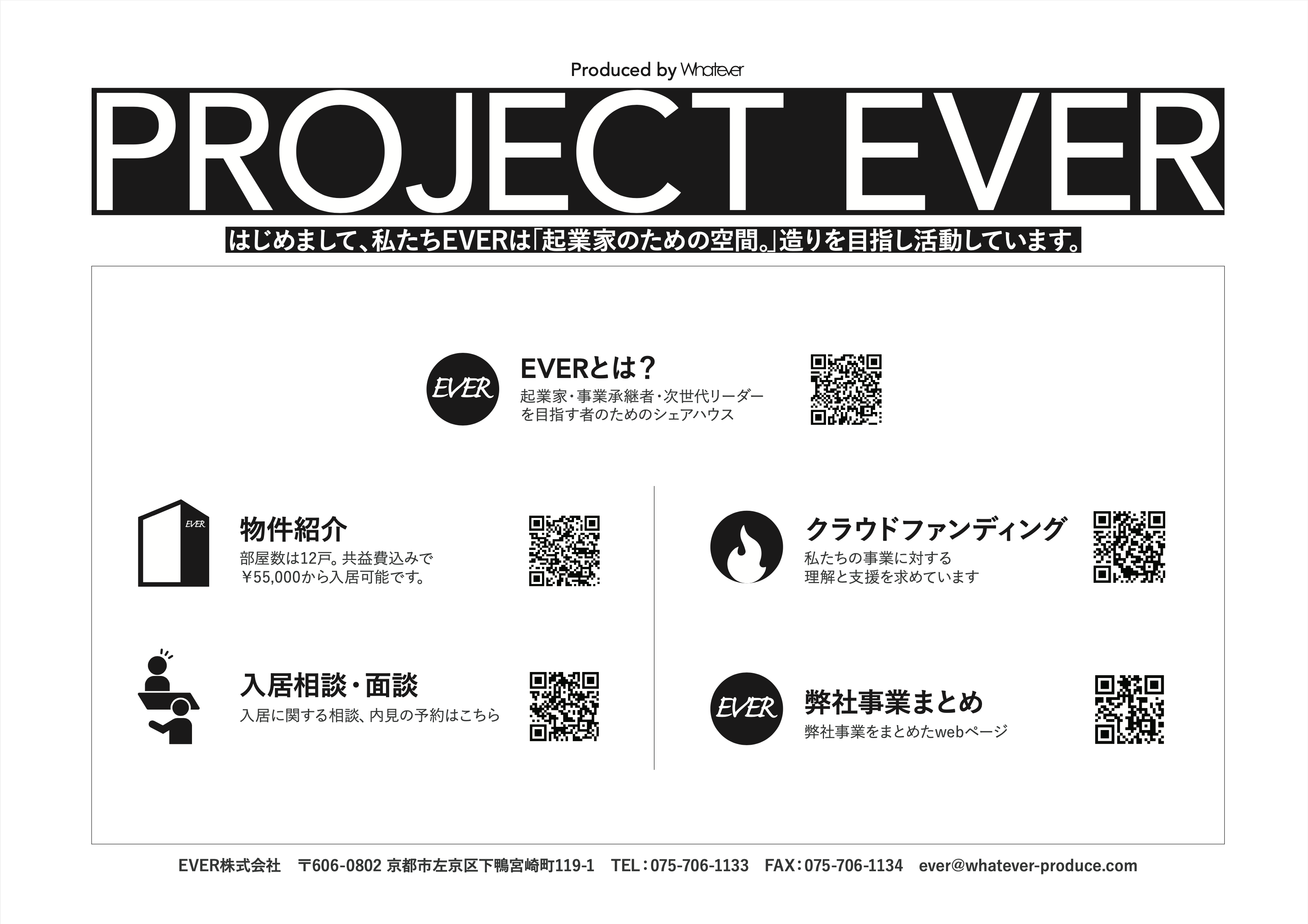 みなさんこんばんは!弊社プロジェクトである、”起業家版のトキワ荘?若手起業家を育成し投資家やVCと繋げるシェアハウスを京都で”のご支援、ご協力をいただき誠にありがとうございました。数多くの皆様からのご支援や、応援のメールやメッセージなど数多くの支えがあり弊社のプロジェクトを進めることが可能となりました。皆様が私たちにしてくださったように、私たちもこれから出会う数多くの挑戦者に対し、私たちができる支援をより強めていく所存です。どうか、これからも弊社ワットエバー株式会社、EVER株式会社の活躍にご期待ください。本当に皆様、ありがとうございました。また、本年9月に北大路駅から徒歩5分かつ鴨川沿に新しく複合施設を提供予定です。River Side京都市営地下鉄:北大路駅から東に徒歩5分京都らしさが感じられる町屋キッチンカー、コーヒースタンドを設置し地域コミュニティの活性化へ京都にお越しの際、または京都にお住まいの方は是非こちらの施設をご利用ください。京都の魅力が詰まったサービスを皆様に提供させていただきます。CAMP FIREの投稿はこれから無くなりますが、もし弊社の情報をお求めであればhttps://lit.link/everwhateverから、弊社の様々なSNSに飛ぶことができますので、ぜひフォローをよろしくお願いいたします。本当に皆様、ありがとうございました。これからも応援よろしくお願いいたします。EVER株式会社 代表取締役 土屋 耕喜
