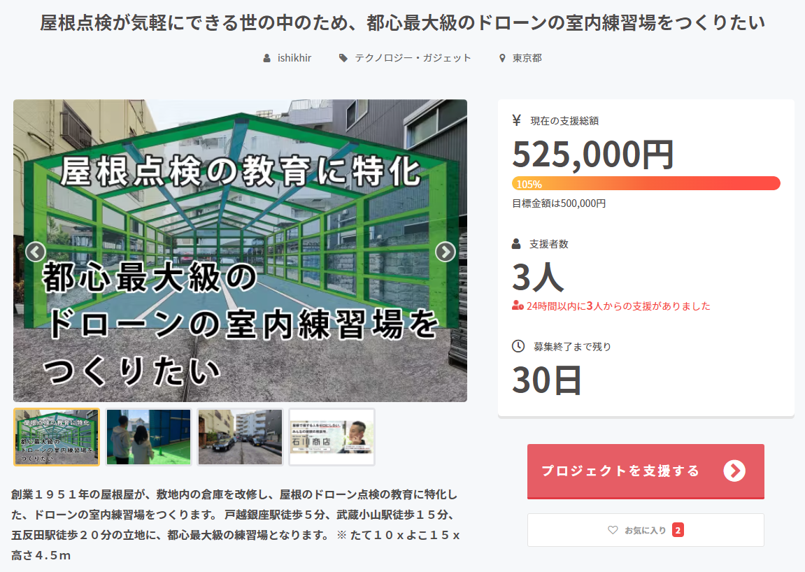 なんと、公開初日に目標金額達成!公開初日で、目標金額を達成できるとは有り難いかぎりです。ご支援いただき、ありがとうございます。8・1のオープンにむけ、気を引き締めて、準備をすすめていきたいと思います。引き続き、ご支援をよろしくお願い致します。命名権は、完売となってしまいましたが、ドローン講習など、限定数があるリターンも、まだまだ余裕があります。引き続きご支援をお願い致します。後日、ネクストゴールを設定して、追記・発表させていただきます。