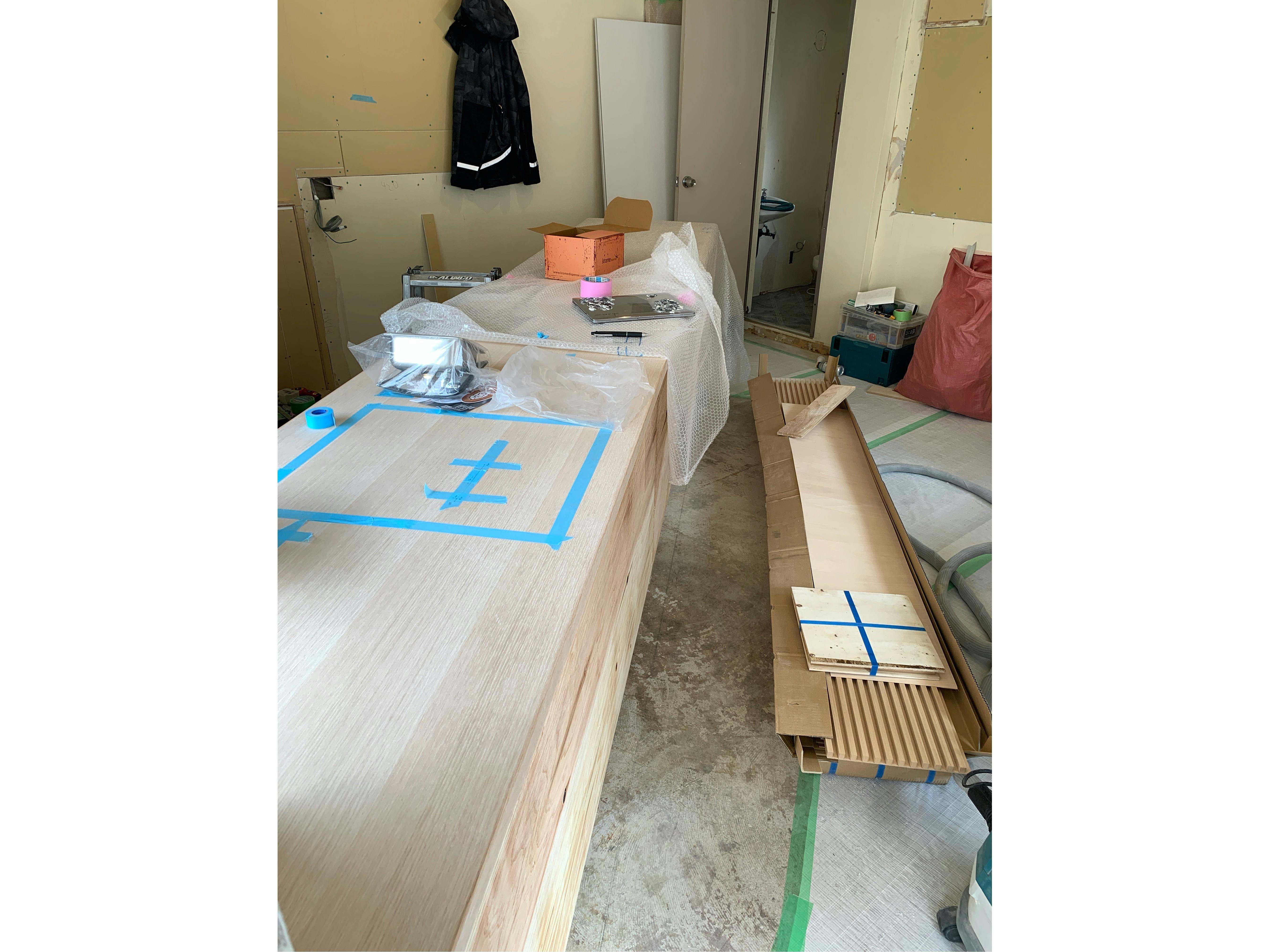 先日三重県からはるばる届いた、カウンター天板が無事に設置され、いよいよお店らしさが増してきました!