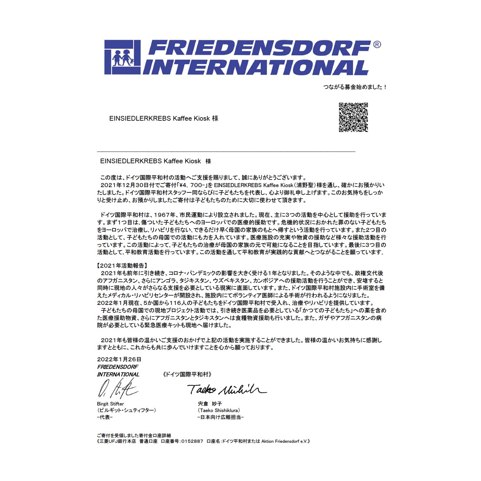 また、間借り営業時代には、ドリンク一杯につき20円を「ドイツ国際平和村」へ寄付するチャリティプログラム「CUP for TWO」を実施し、2020年12月〜2022年2月までに計20,150円を皆様から頂戴したドリンク代から寄付させていただきました。