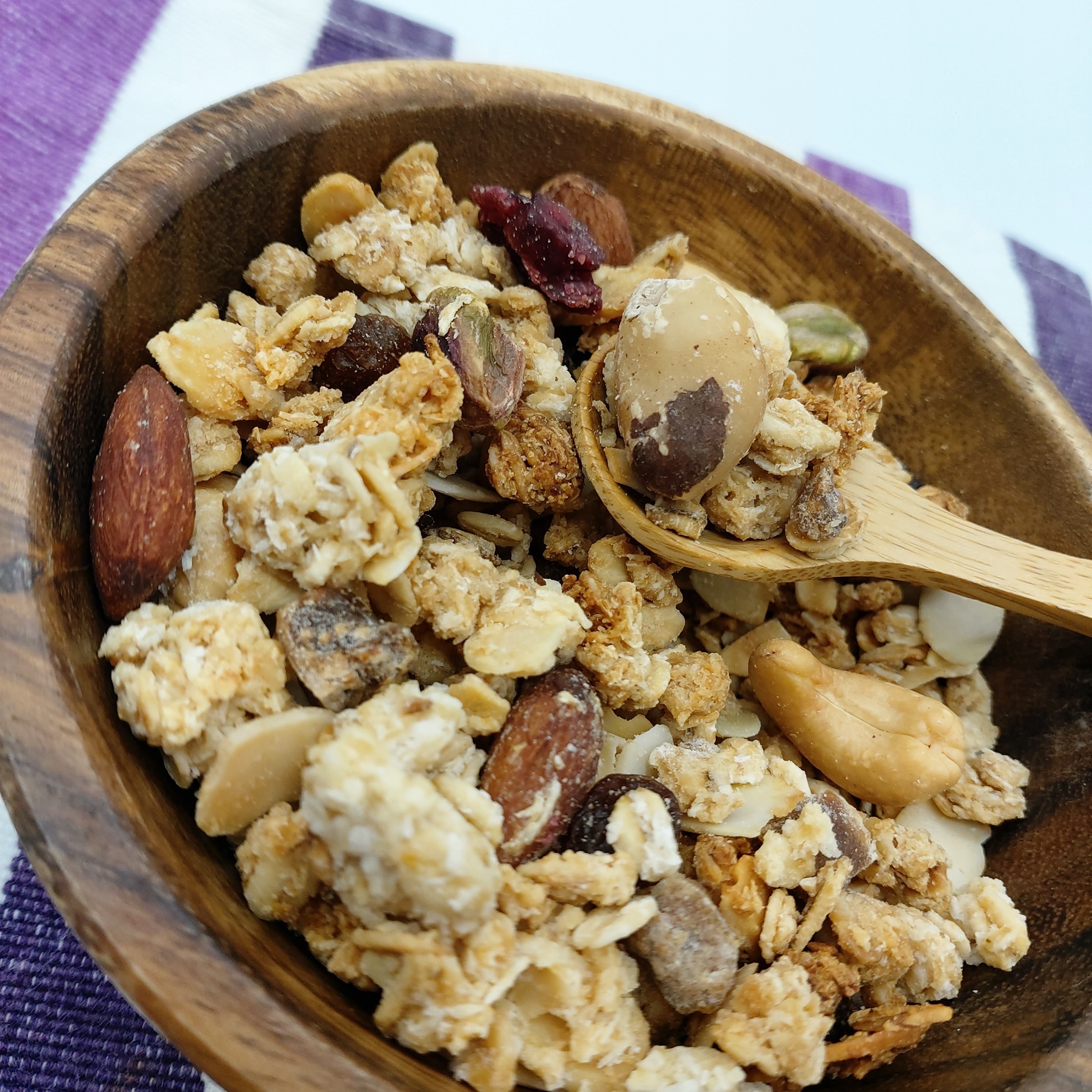 朝日製粉所の米粉や玄米粉と有機オートミール、甘酒などを合わせ、オーブンで香ばしく焼き上げました。有機メープルシロップでコクを出し、有機ココナツオイルを使用することで食感はザクザク!