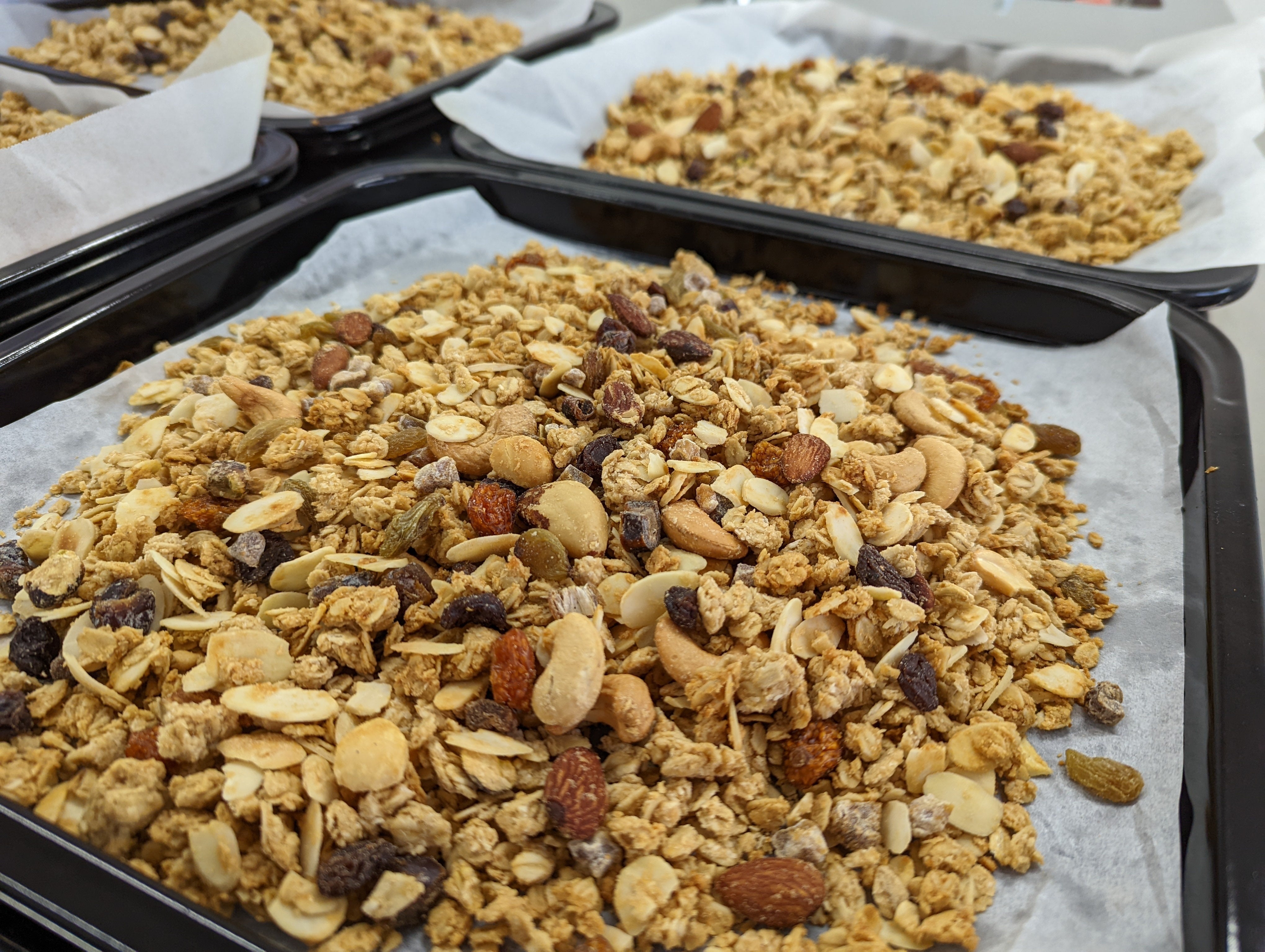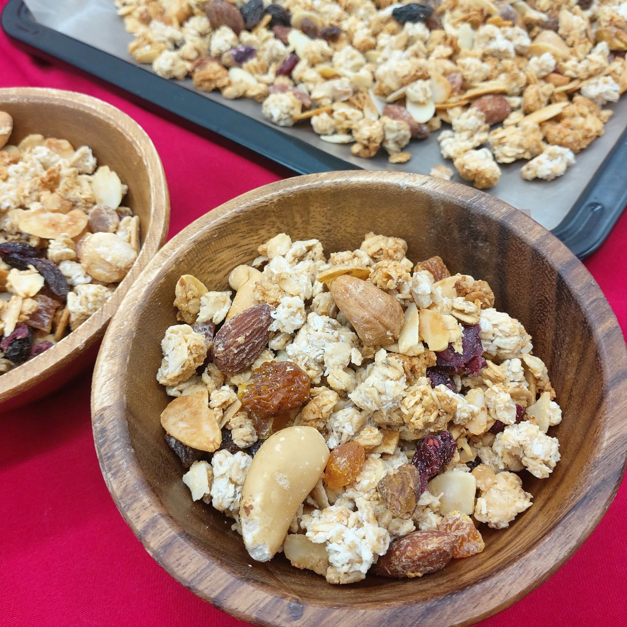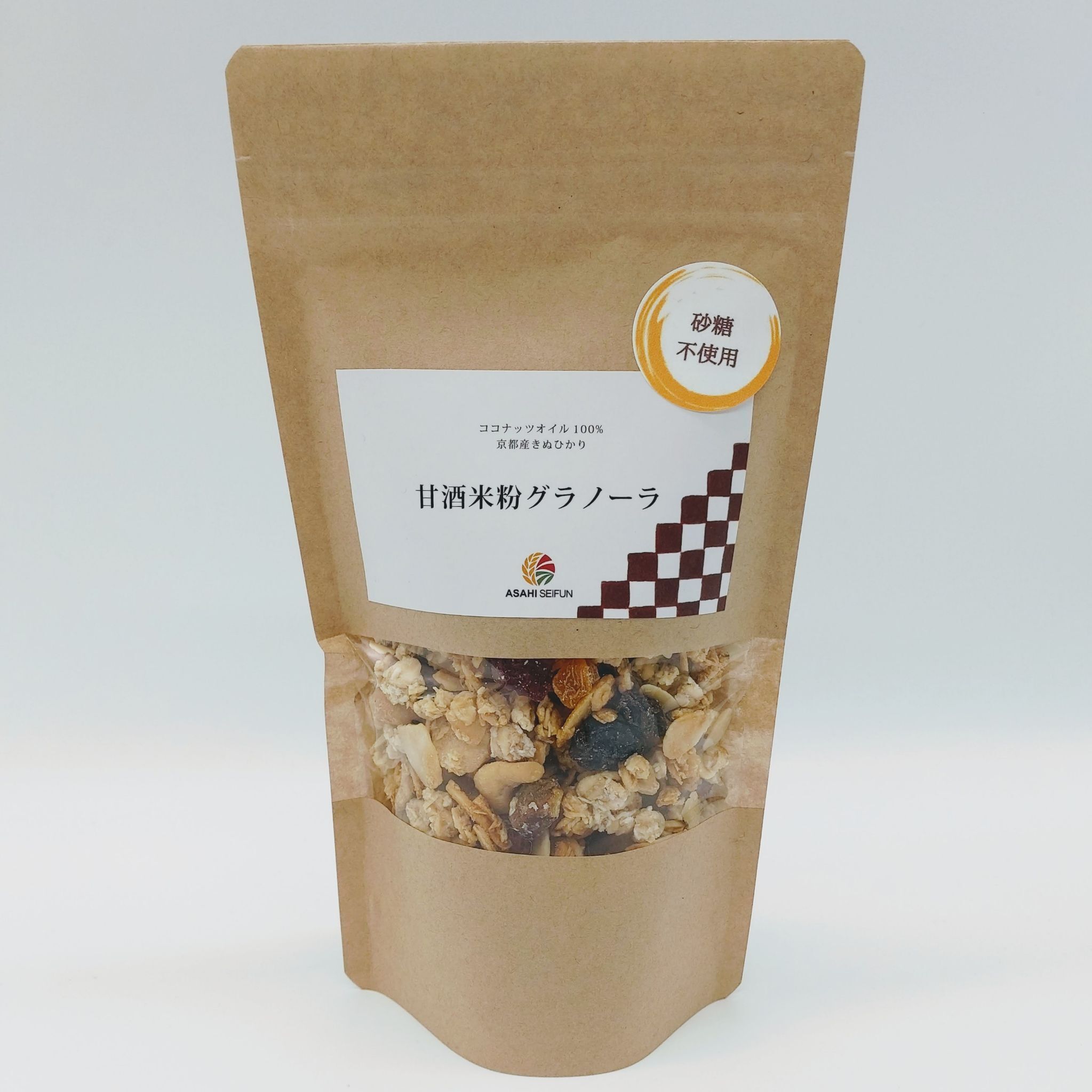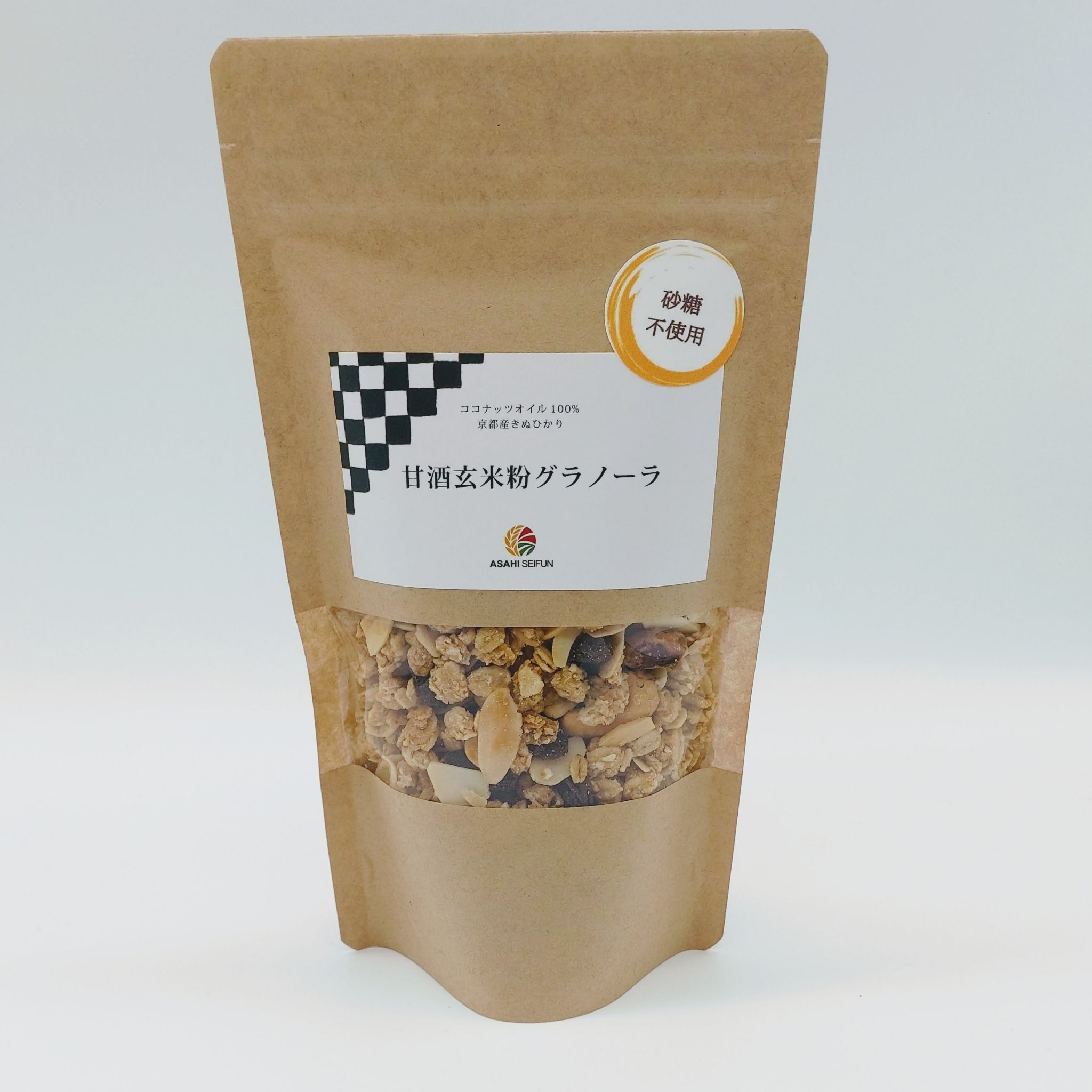 「甘酒米粉グラノーラ」「甘酒玄米粉グラノーラ」とは、朝日製粉所の米粉・玄米粉を使用し、砂糖を一切使用せず甘酒や有機メープルシロップでやさしい甘みを付けたグラノーラです。