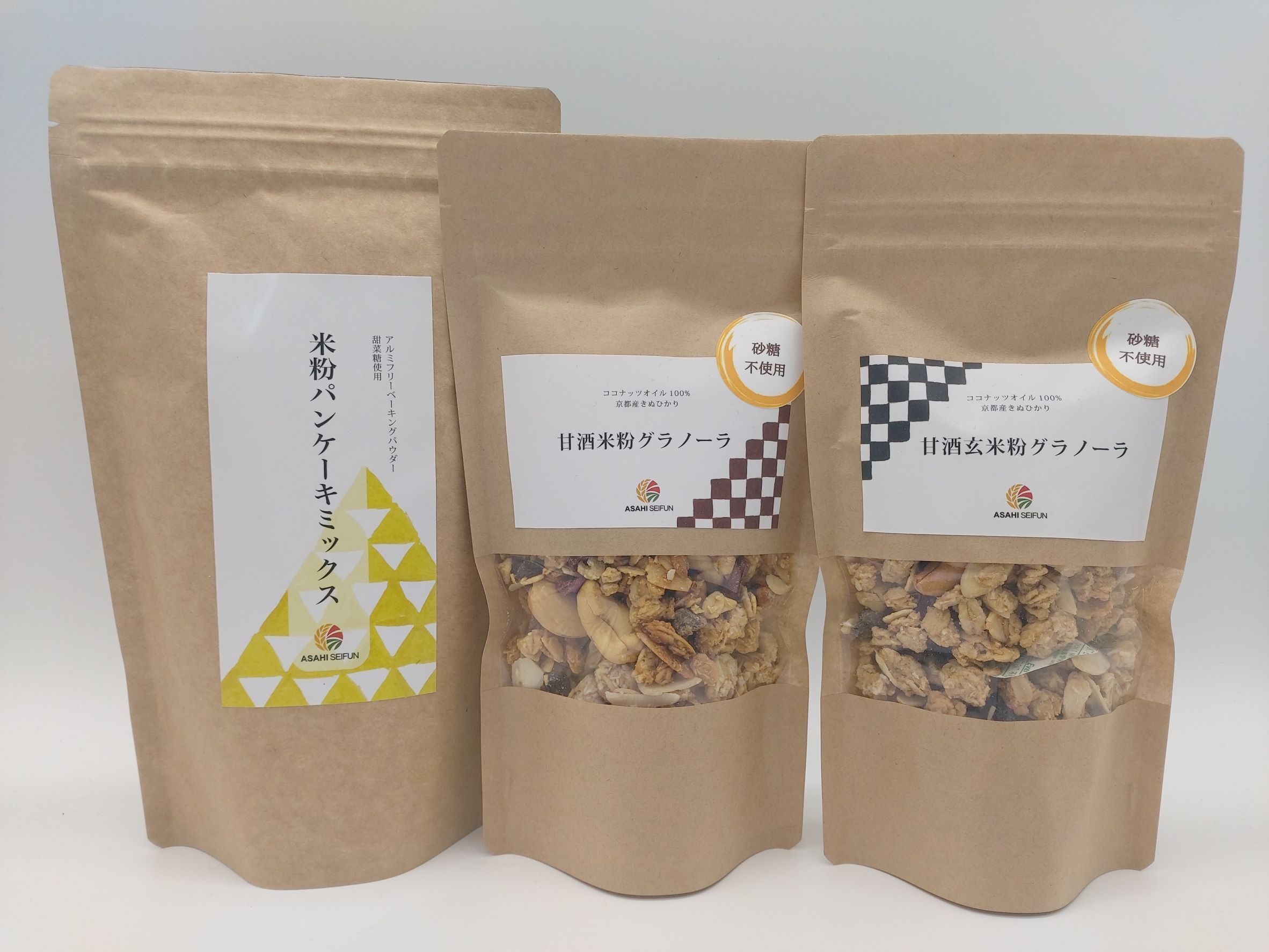 ❹甘酒米粉グラノーラ、甘酒玄米粉グラノーラ (各150g)、米粉パンケーキミックス(300g) 3点セット 4000円 (送料、税込)
