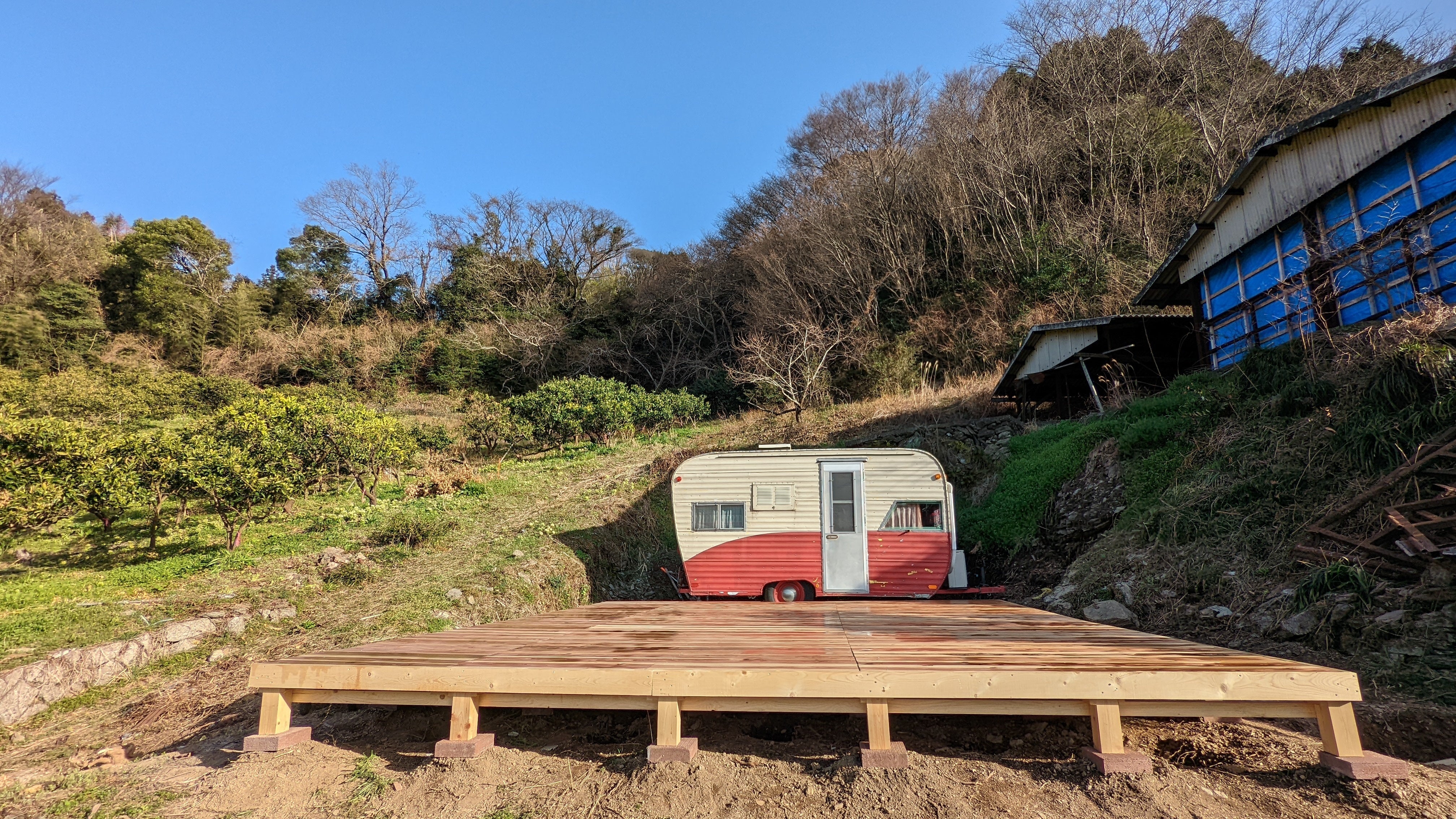 1月から整備をはじめていますが、現状はトレーラハウス搬入完了、ウッドデッキ完成、バイオトイレ・薪風呂設置工事中です(4月上旬現在)。