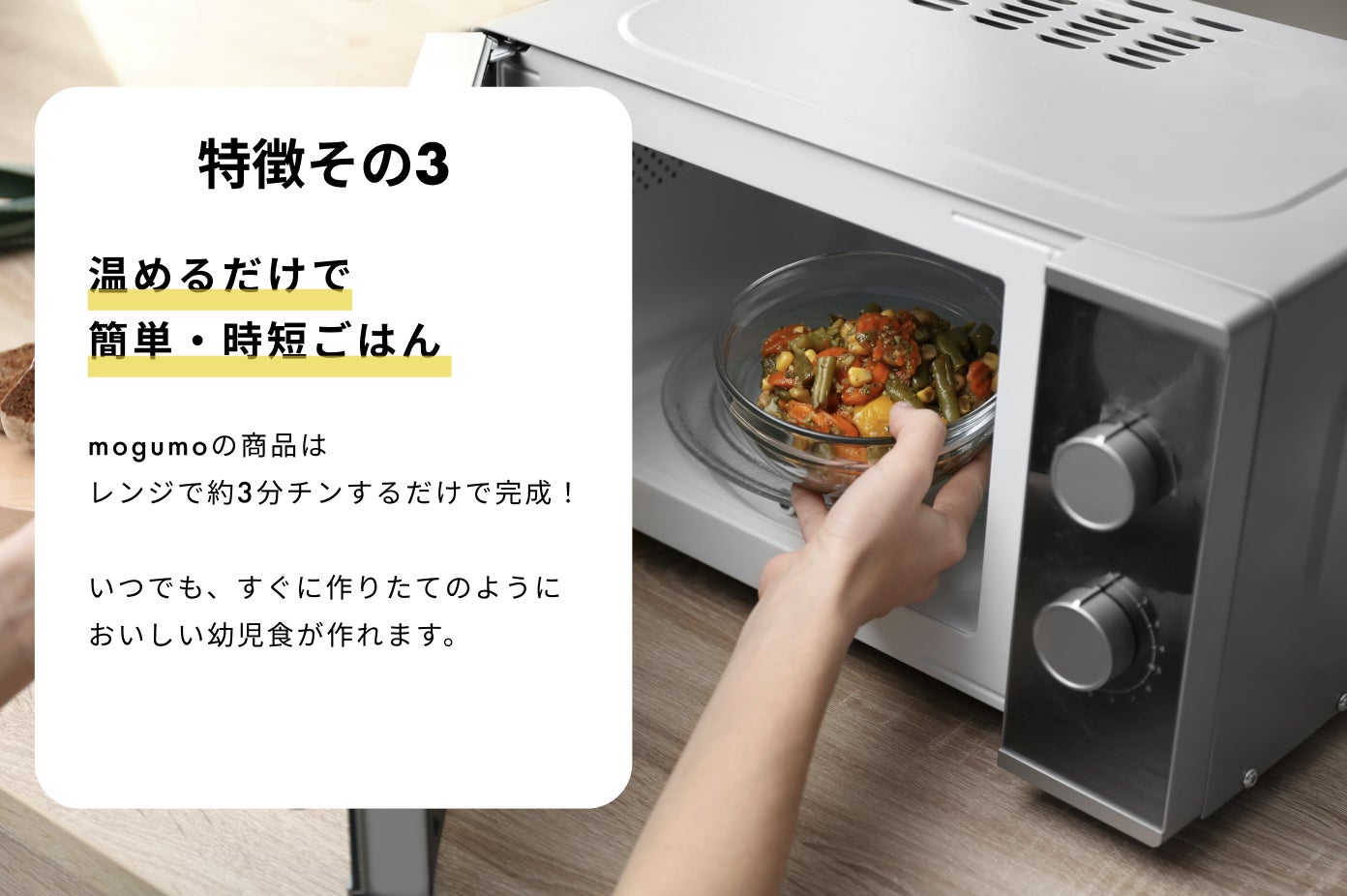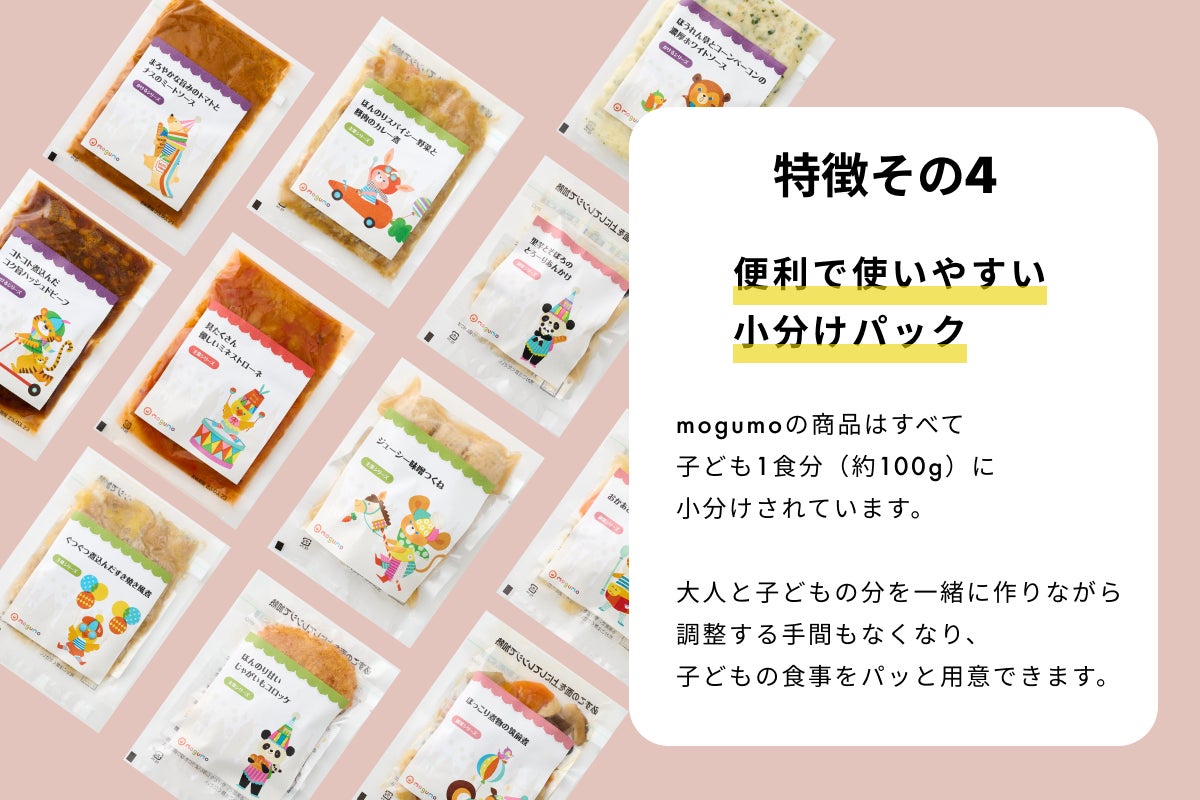 mogumoの商品は子ども向けに味付けを調整し、栄養バランスも整えた食品です。