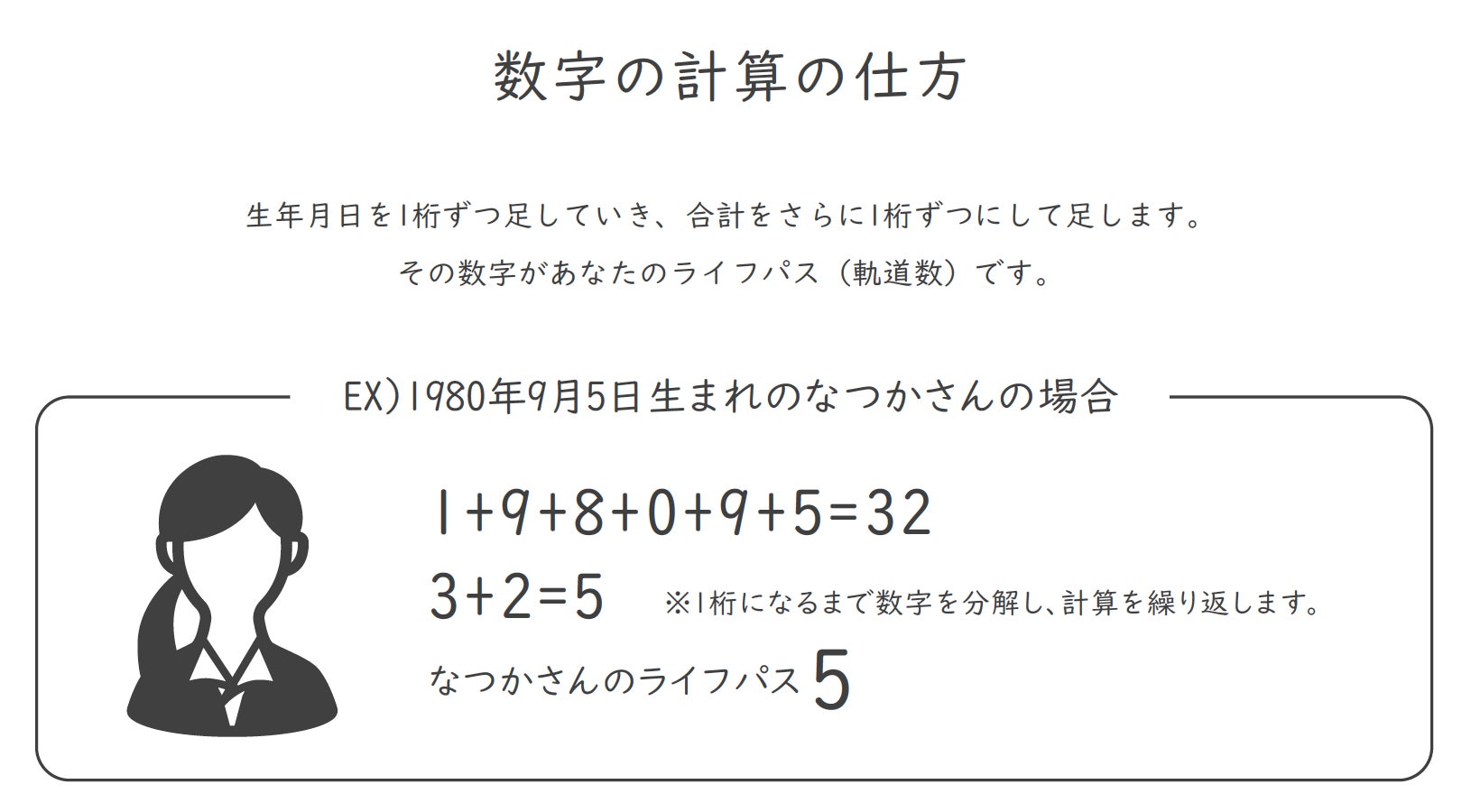 この個性を知るためのツールとして、私が伝えているのが数秘術です。誕生日からライフパスナンバーといわれる数字を導き、それぞれの個性を読み解きます。