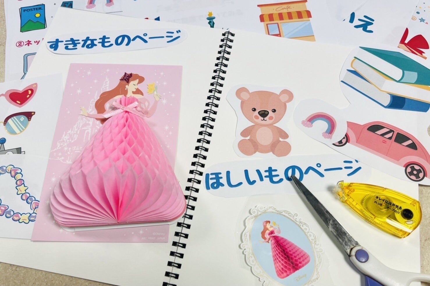 切り抜いた写真をスケッチブックに並べて、バランスのよいところに貼り付けましょう。かわいいマスキングテープやシールでデコレーションをするとワクワク感が倍増。