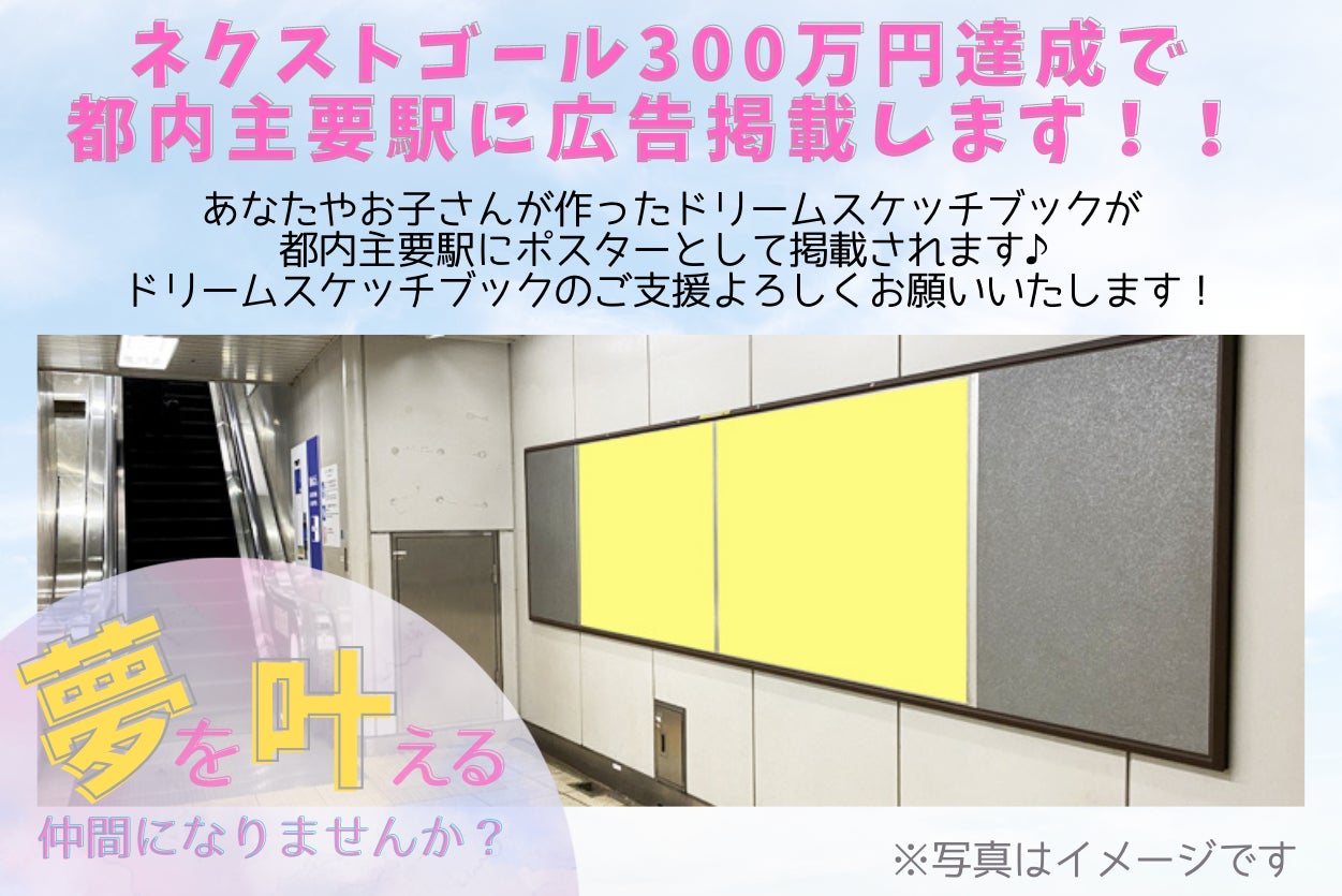 ネクストゴール300万円達成で、都内主要駅に広告掲載します。あなたやお子さんが作ったドリームスケッチブックが、都内主要駅にポスターとして掲載されます♪