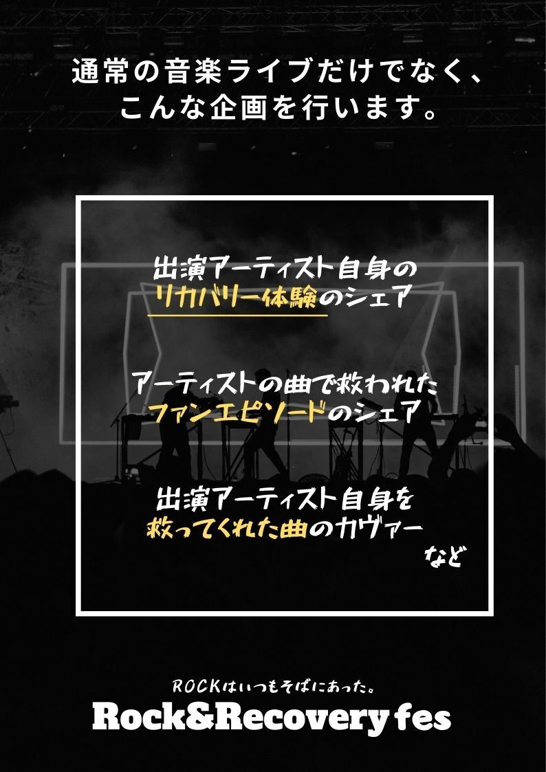内容:オーディエンスとアーティストでリカバリー体験を共有するための音楽イベントです。