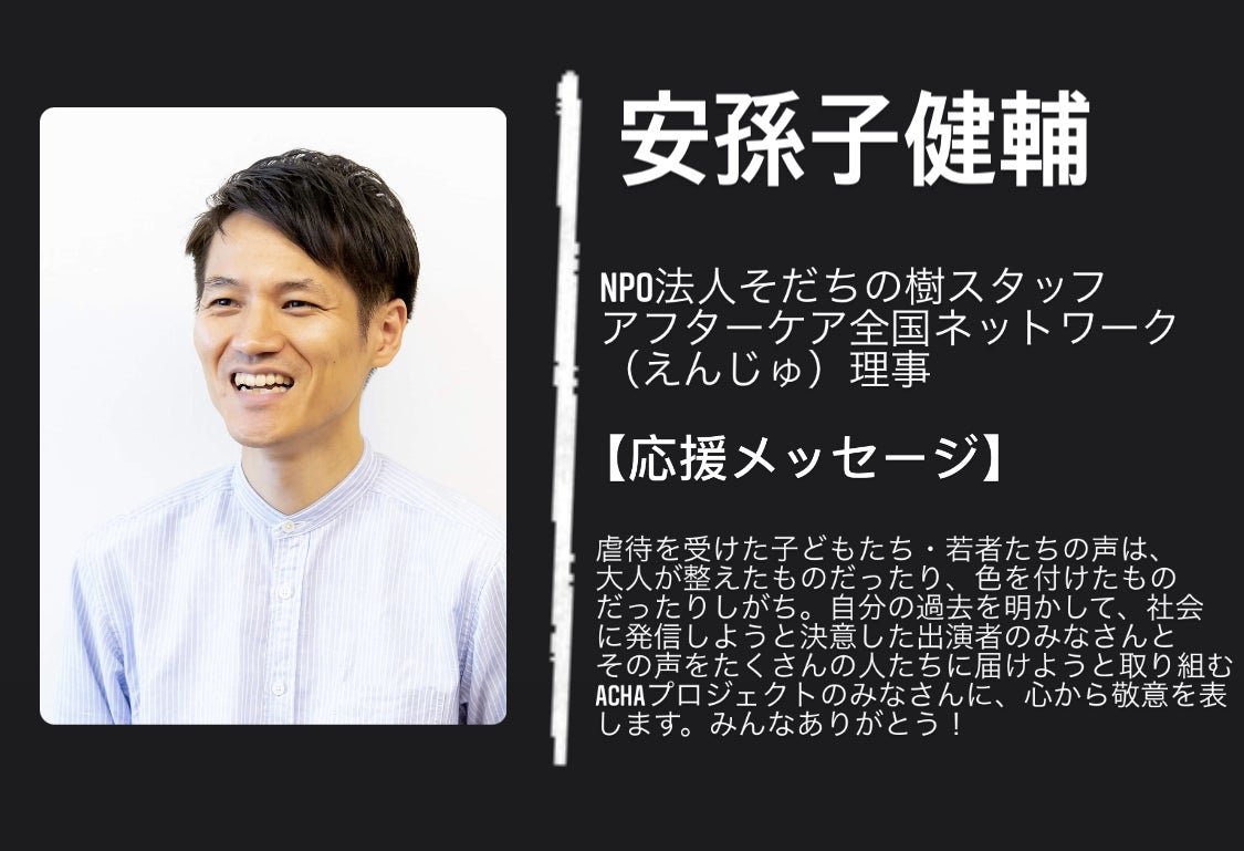 現在は同じ境遇の若者達を支援する団体ACHAプロジェクトを立ち上げ代表を務めています。