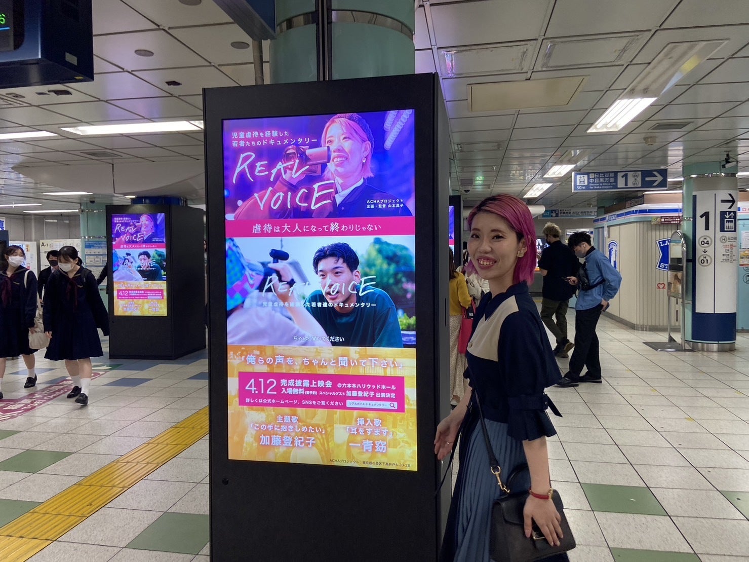 2023年4月1日~30日まで東京メトロ六本木駅の9本の柱に15秒間の広告CMが流れています。もしも近くまでお立ち寄りになった際にはぜひ観に行ってみてください。SNSにて「#虐待は大人になって終わりじゃない」をハッシュタグに応援メッセージの投稿も募集しています。4月12日の映画披露上映会でお会いできる皆様楽しみにしています。18:00~開場にて18:50まで監督山本昌子と挨拶や記念写真撮影も可能です。--------------------------------------4月12日19:00〜六本木ハリウッドホール映画披露上映会無料チケットhttps://peatix.com/event/3489386予告編(1分)https://youtu.be/r26eWKcKiHYホームページhttps://real-voice.studio.site-------------------------------------