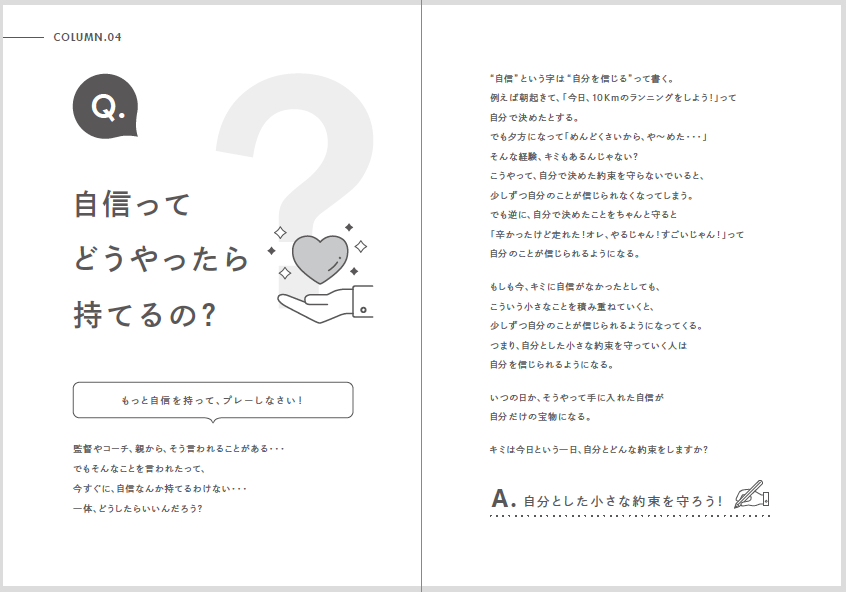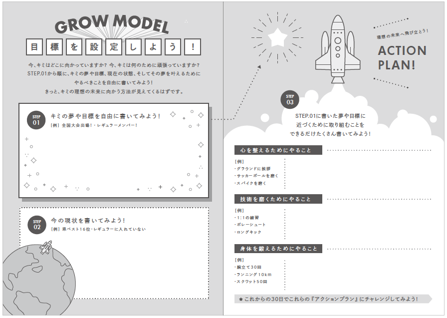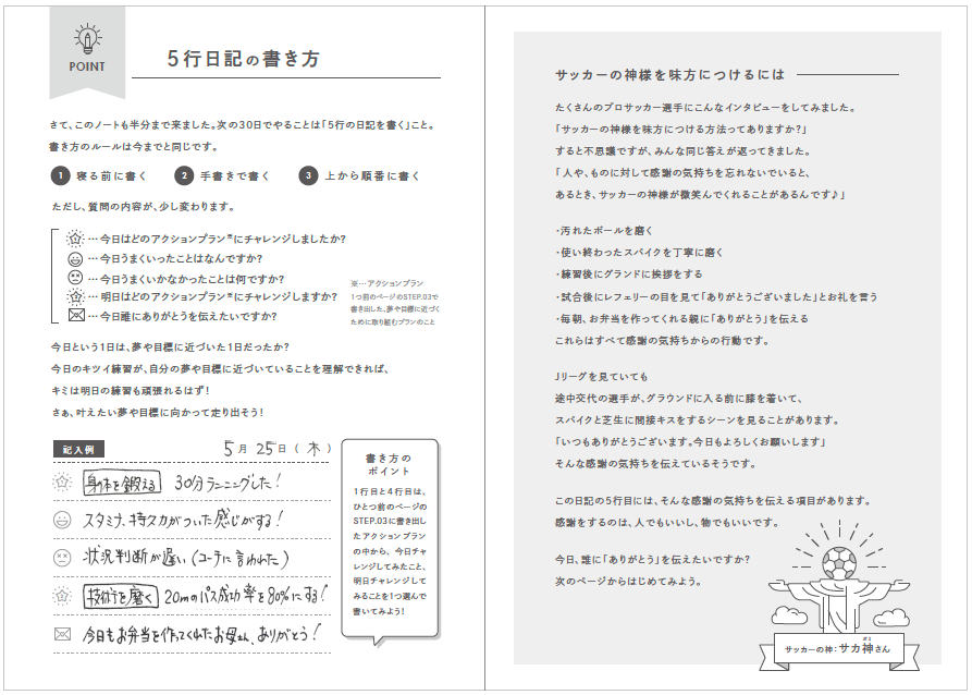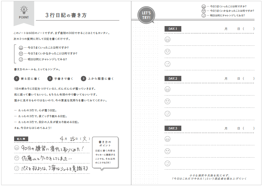 思春期で不安定な小学生高学年や中学生年代は、自分の感じたことや考えたことを言葉にする能力=言語化能力を育む必要性があります。そのためには1日の終わりに、”今日はどんな1日だった?””明日はどんな1日にする?”などの簡単な質問に答え、それを書き出す練習を積み重ねることで、自分の心が”見える化”され、複雑な思考もシンプルに整理できる様になります。また”やらされる練習”ではなく自分の目標に向けた”意味のある練習”を自分で考える能力も身についていきます。これを60日間繰り返すと、徐々に自信が生まれ、”自分のココロとつながる”感覚が生まれてきます。