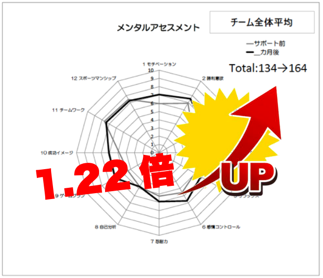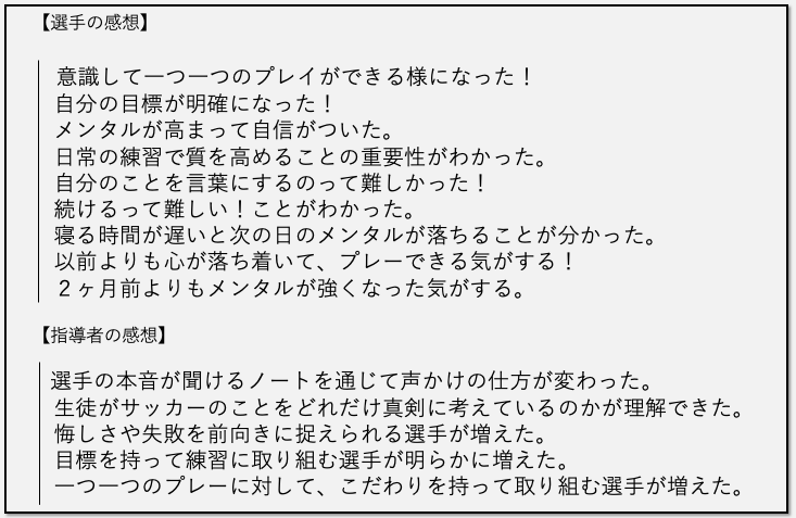 神奈川県葉山中サッカー部を始め、全国12のスポーツチームにメンタルノートを試験的に導入しました。週に一度、指導者はノートを回収し「いつも見てるよ!」「よく頑張っているな!」などの承認の言葉や一言アドバイスを添えたところ、徐々に選手はノートを通じて自分の考えや意見を伝えられる様になりました。そして、指導者も選手の気持ちに寄り添った声かけや問いかけができる様になった結果、60日後にメンタル成長率が1.22倍もアップしました。この様にメンタルノートには、言葉にしたものをお互いに共有することで相互理解が深まり、”選手と指導者のココロのつながり”を作るという役割もあります。