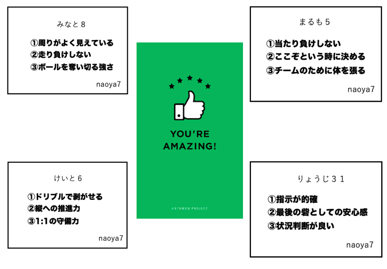 ”人間には誰しも3つの才能の種が与えられている”という古くからの言い伝えがヨーロッパにはあるそうです。「足が速い!」「強いシュートが打てる!」「リーダーシップがある!」など明確な特徴がある選手は分かりやすいのですが、自分の才能、強みや武器を理解できている選手は少なくありません。そこで、グリーンカードの裏面に自分の素晴らしいと思うところをチームメイトに書いてもらうことで、自分では気づけなかった才能や能力を発見し、それを日々の練習で磨く努力をすることでチームスポーツに貢献できるようになります。またこのカードをチームメイトとお互いに交換し合うことで”仲間とのココロのつながり”が生まれる様になります。