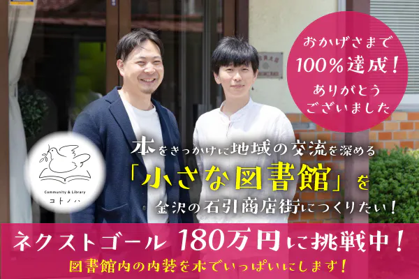 Community&Libraryコトノハ「小さな図書館づくり」への、たくさんの応援・ご支援を頂いており、達成率100%を超えました。本当にありがとうございます!