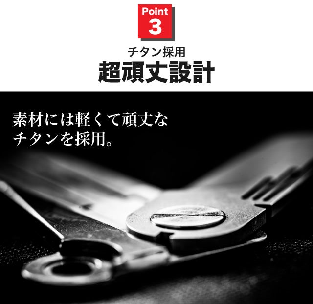 頑丈なのはもちろん 「いつも携帯できるマルチツール」であるコンセプトを1番に考え素材から厳選した結果、チタンを採用しての製造に至りました。