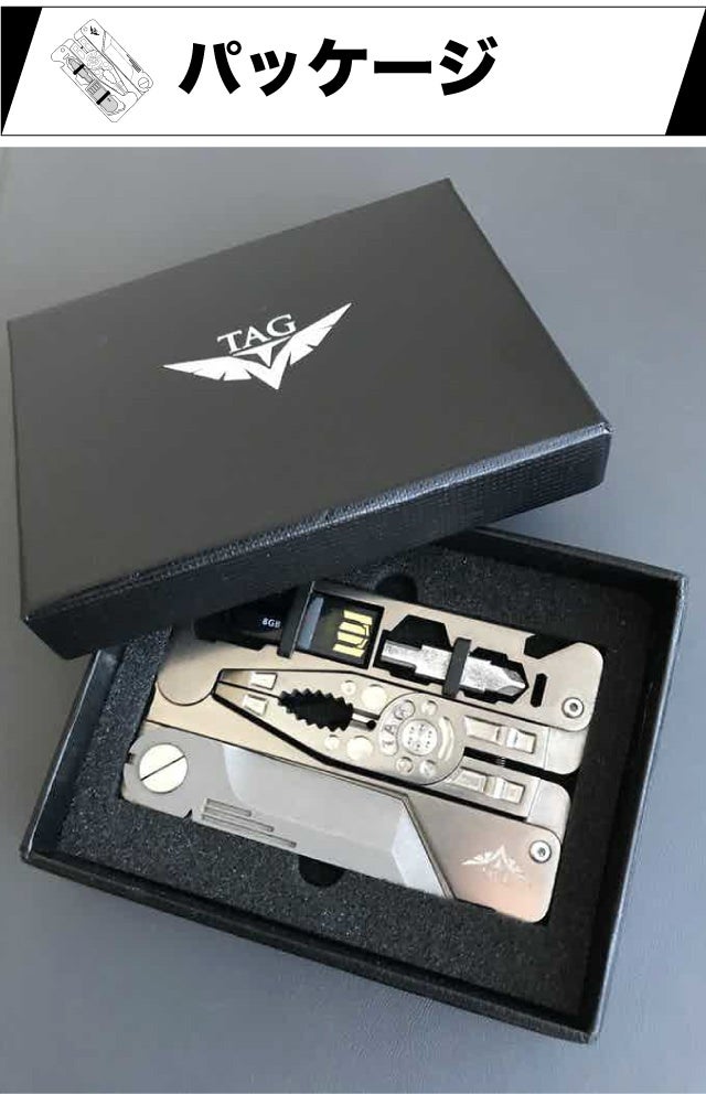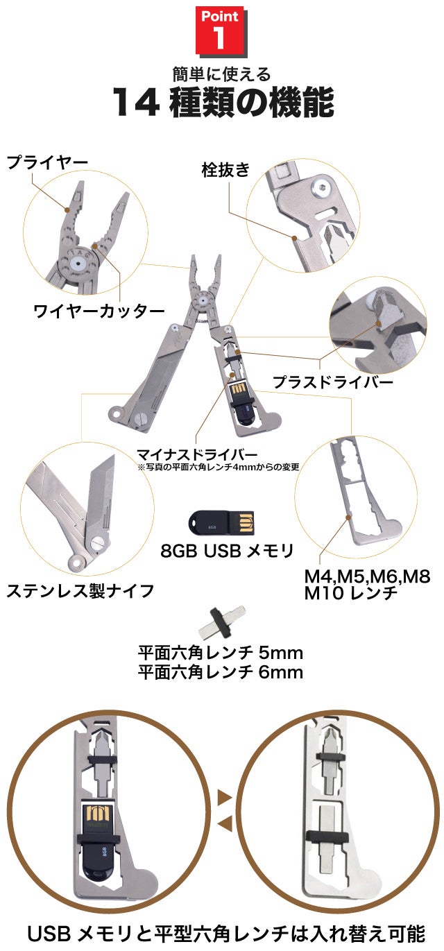 ◯ 機能:プライヤー・ワイヤーカッター・ナイフ・栓抜き・フィリップスライバー・マイナスドライバー・平面型六角レンチ2種・M4/M5/M6/M8/M10レンチ・8GB USBメモリ