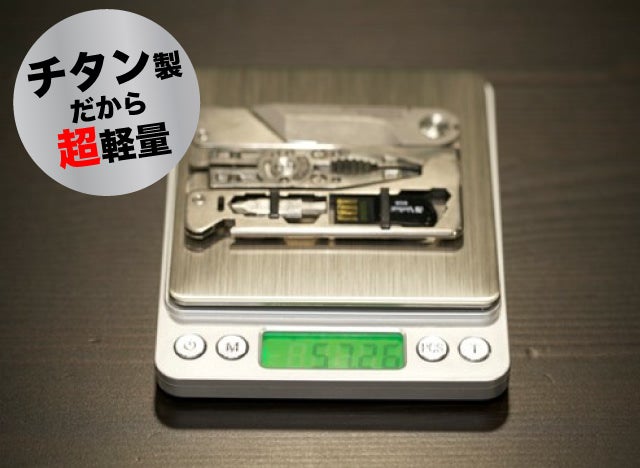 軽くて錆びにくく頑丈なチタン製。重量はわずか57.26g。一般的な工具は重く、かさばるものが多い中、SUPRAはとても軽量で持ち運びに大変便利です。