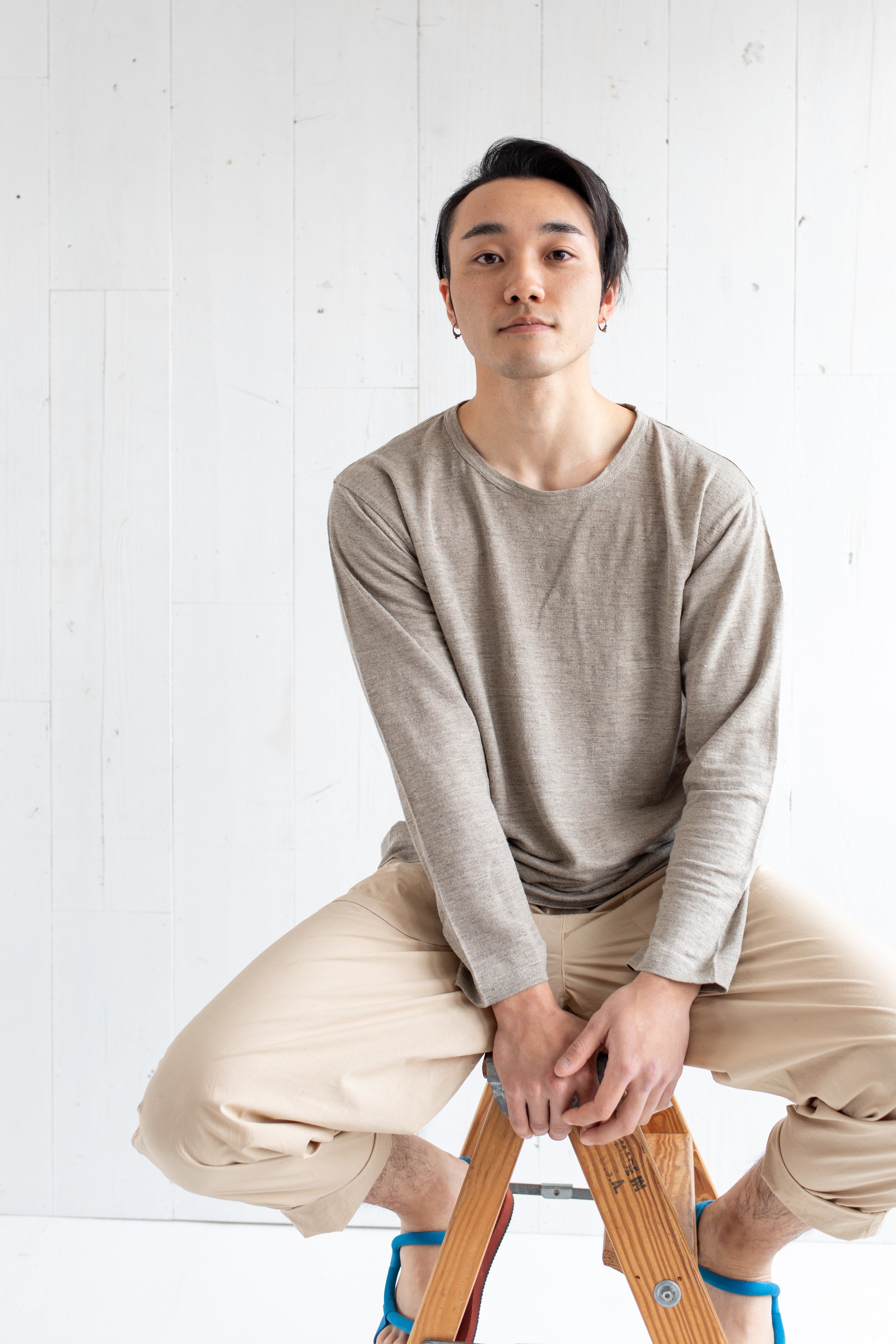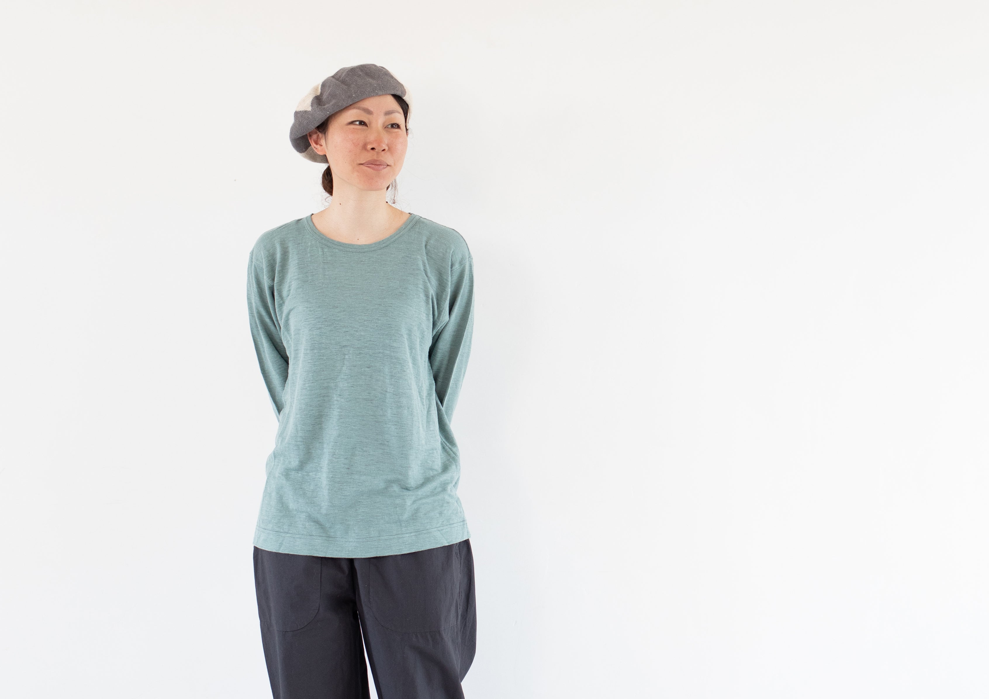 改良を続けているヘンプ100%の生地を使った「ヘンプグッド Tシャツ」の最新版で、3シーズン使える長袖仕様。春先のインナーとして、また真夏に日焼けをしたくないという方にもおすすめ。袖が9部丈になっているのは、シンプルなデザインの中でもシルエットに変化をつけるため。
