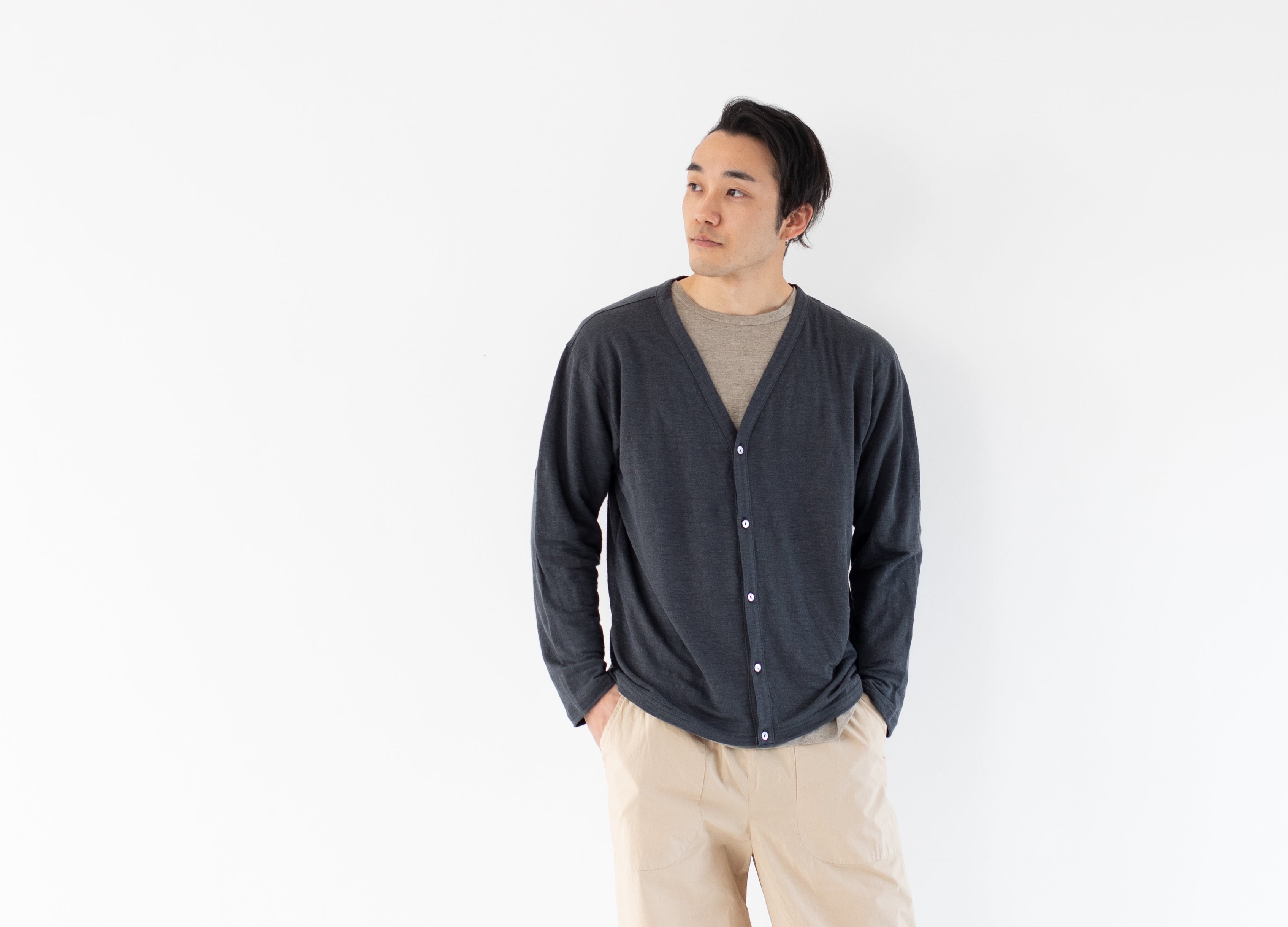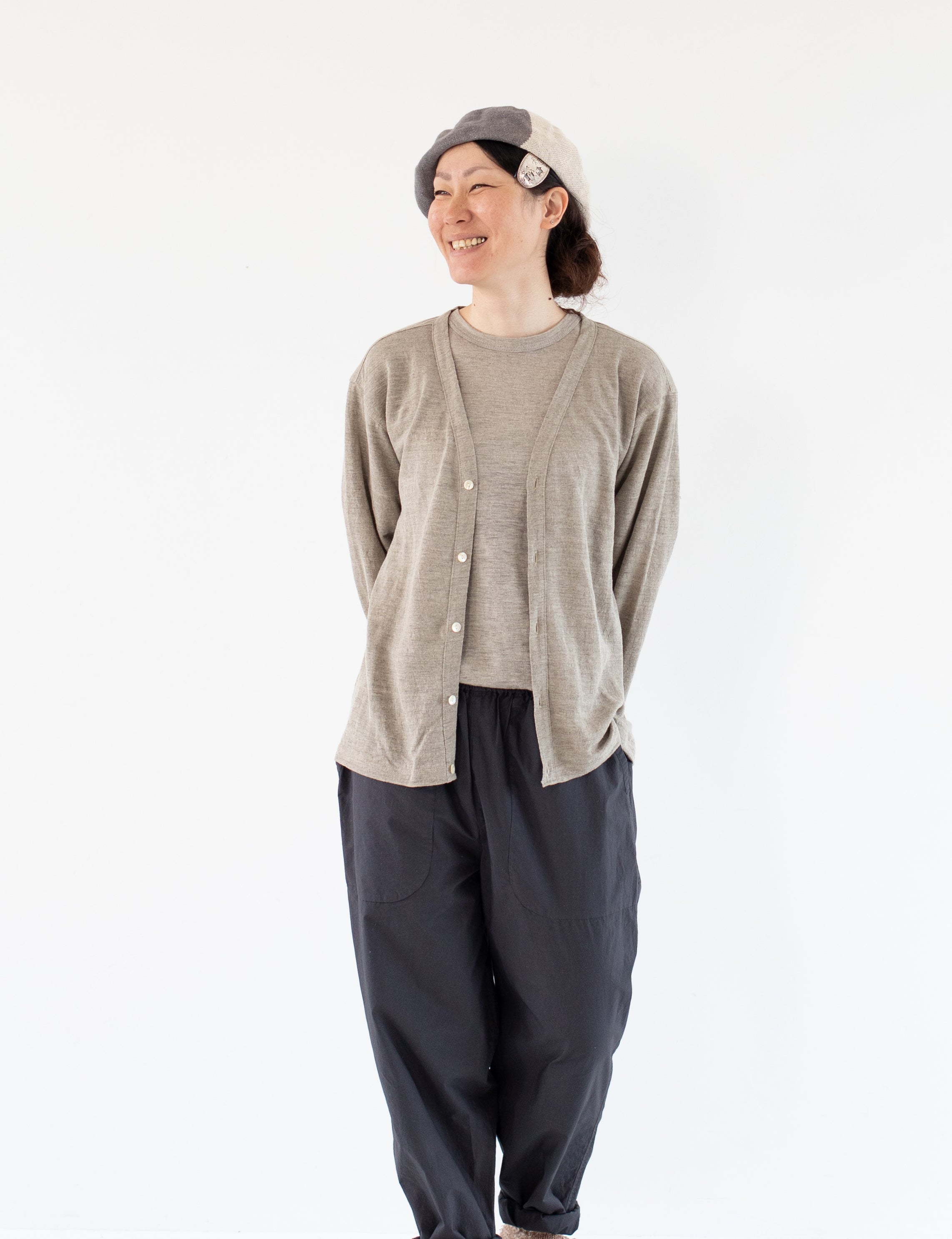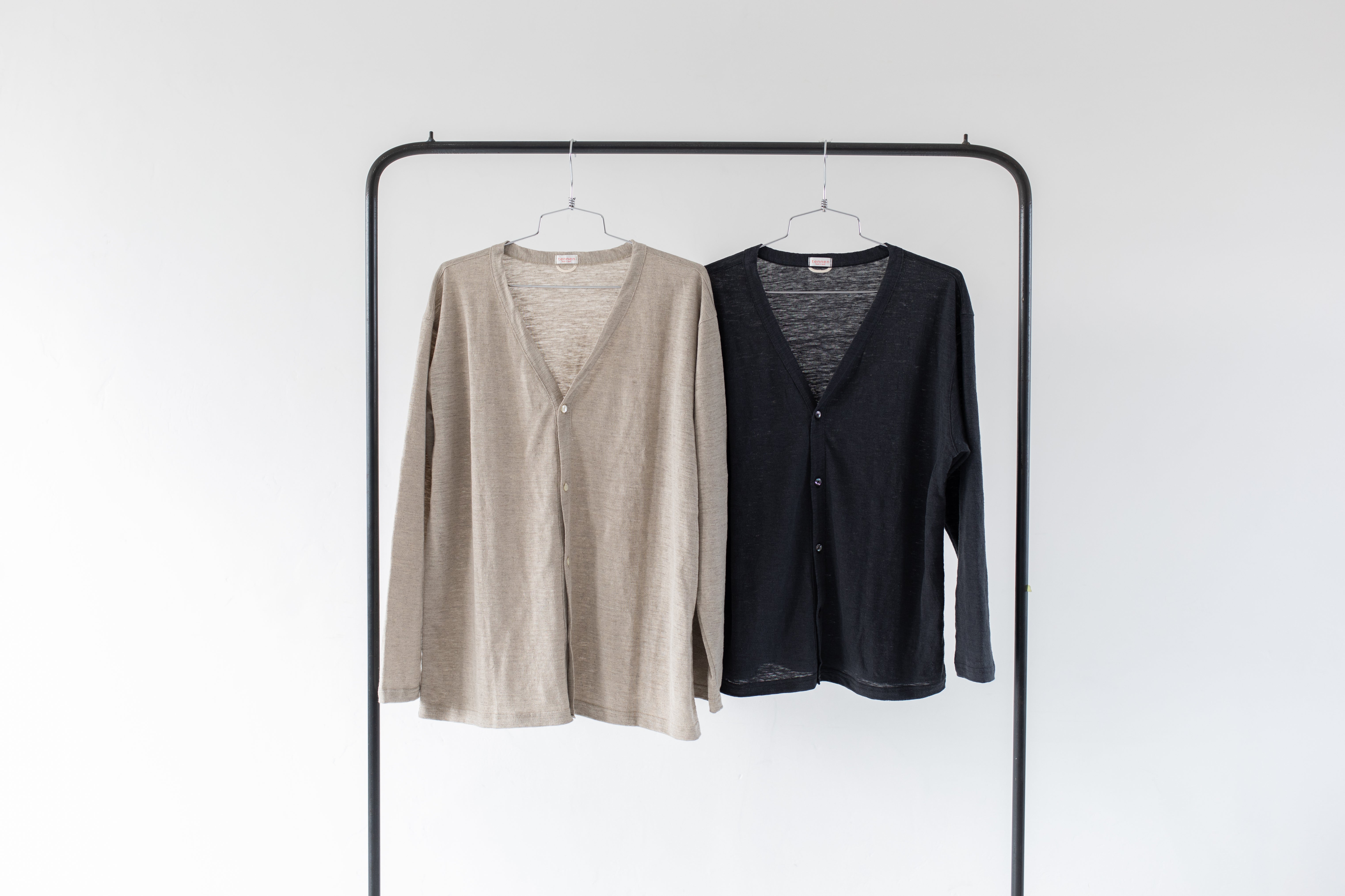 カーディガンは色はキナリとチャコールの2色。手持ちのお洋服と合わせやすいよう、ベーシックな色味で展開します。