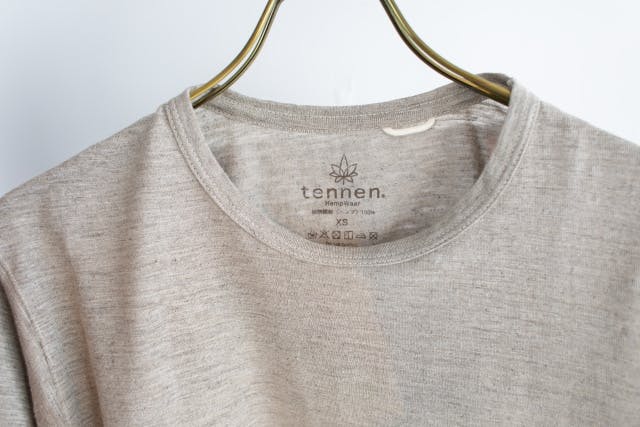 自然分解性に配慮して品質表示は首元のプリントに。ヘンプの特性を熟知した日本の工場が生地を編み、日本で丁寧に縫製されています。