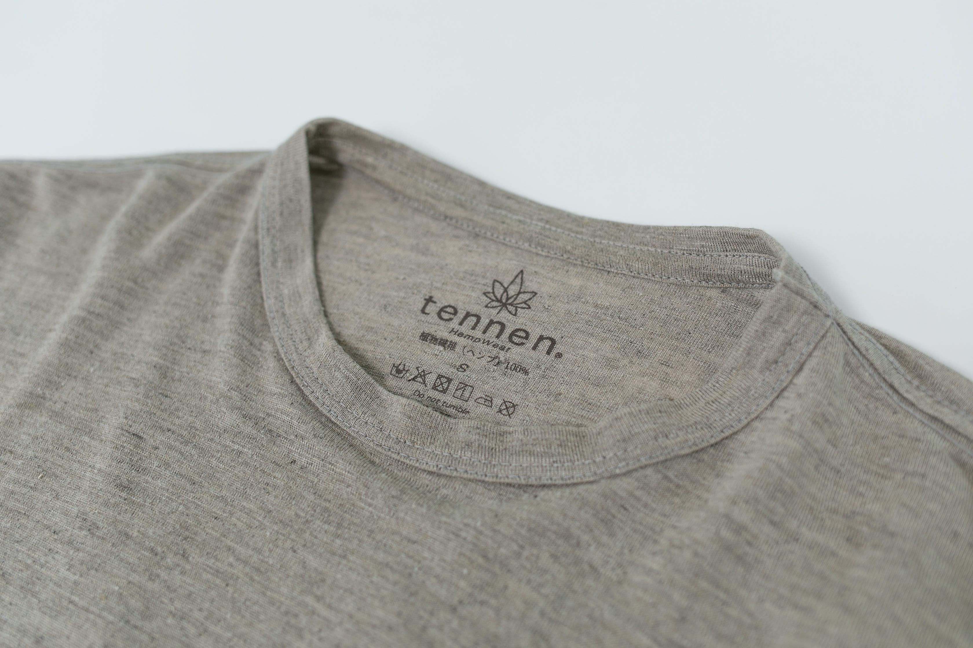 自然分解性に配慮して品質表示は首元のプリントに。ヘンプの特性を熟知した日本の工場が生地を編み、日本で丁寧に縫製されています。